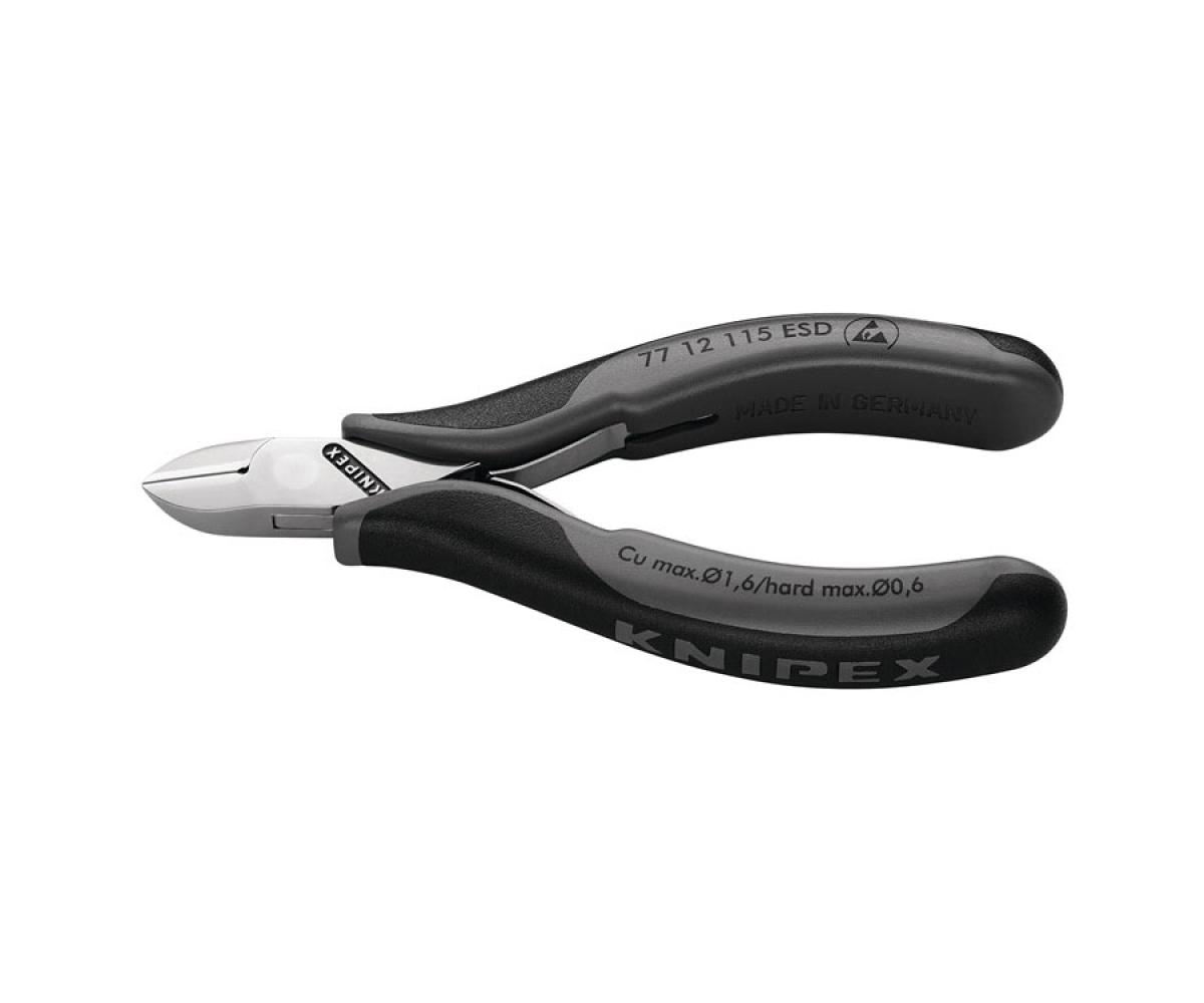 ESD · für feinste Schneidarbeiten z. B. in Elektronik und Feinmechanik · durchgestecktes, spielfreies Gelenk · Schneiden zusätzlich induktiv gehärtet, Schneidenhärte ca. 62 HRC · mit Öffnungsfeder · Spezial-Werkzeugstahl in Sondergüte geschmiedet, mehrstufig ölgehärtet · elektrisch ableitend - dissipativ Kopf spiegelpoliert