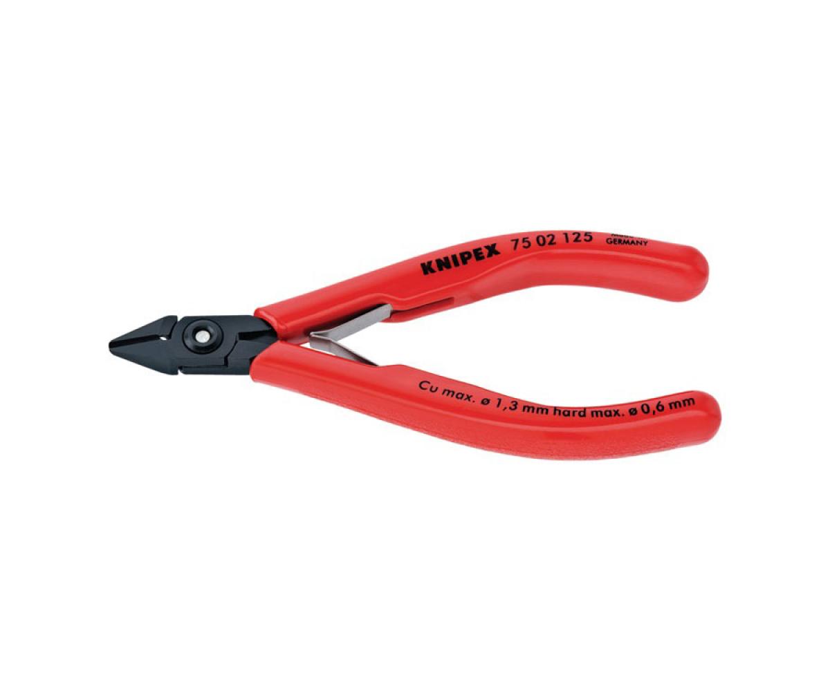 Weitere technische Eigenschaften · A: 10,5mm · D: 6,5mm · Feder: mit Öffnungsfeder · Griff: Kunststoffüberzug · Material: Spezialwerkzeugstahl · B: 14mm · Norm: DIN ISO 9654 · Elektronik-Seitenschneide · r L.125mm Form 0 Facette · ja KNIPEX ·