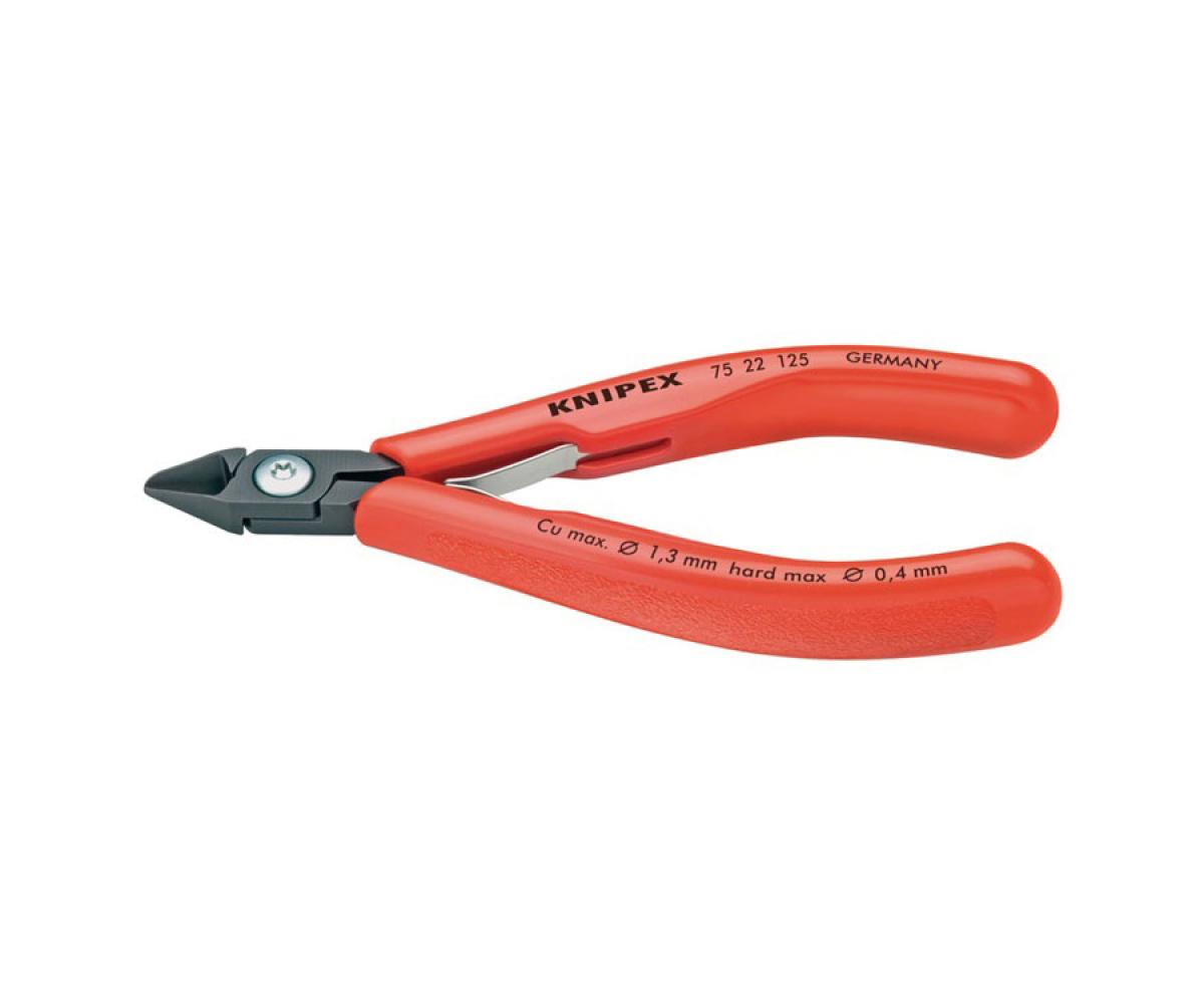 Weitere technische Eigenschaften · A: 10,5mm · D: 6,5mm · Feder: mit Öffnungsfeder · Gewicht: 79g · Griff: Kunststoffüberzug · Material: Spezialwerkzeugstahl · B: 14mm · Norm: DIN ISO 9654 · Elektronik-Seitenschneide · r L.125mm Form 2 Facette · ja,kl.KNIPEX ·