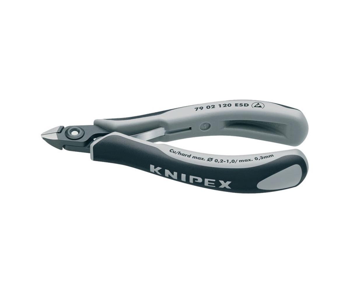 ESD · für feinste Schneidarbeiten z. B. in Elektronik und Feinmechanik · geschliffene, scharfe Schneiden · Schneiden zusätzlich induktiv gehärtet, Schneidenhärte ca. min. 64 HRC · ca. 20% weniger Gewicht · geschraubtes Gelenk · Öffnungsfeder · Chrom-Vanadin-Kugellagerstahl, geschmiedet, mehrstufig ölgehärtet · elektrisch ableitend - dissipativ Zange brüniert · Kopf poliert