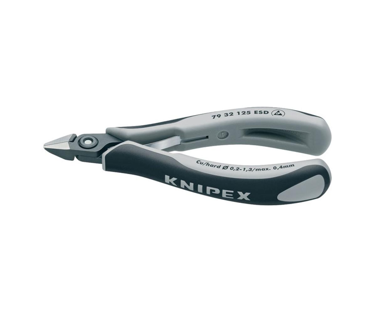 ESD · für feinste Schneidarbeiten z. B. in Elektronik und Feinmechanik · geschliffene, scharfe Schneiden · Schneiden zusätzlich induktiv gehärtet, Schneidenhärte ca. min. 64 HRC · ca. 20% weniger Gewicht · geschraubtes Gelenk · Öffnungsfeder · Chrom-Vanadin-Kugellagerstahl, geschmiedet, mehrstufig ölgehärtet · elektrisch ableitend - dissipativ Zange brüniert · Kopf poliert
