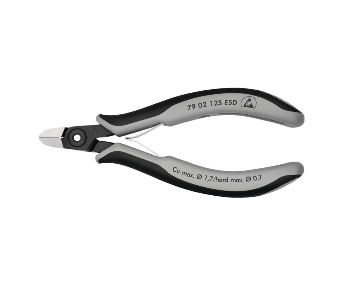 ESD · für feinste Schneidarbeiten z. B. in Elektronik und Feinmechanik · geschliffene, scharfe Schneiden · Schneiden zusätzlich induktiv gehärtet, Schneidenhärte ca. min. 64 HRC · ca. 20% weniger Gewicht · geschraubtes Gelenk · Öffnungsfeder · Chrom-Vanadin-Kugellagerstahl, geschmiedet, mehrstufig ölgehärtet · elektrisch ableitend - dissipativ Zange brüniert · Kopf poliert