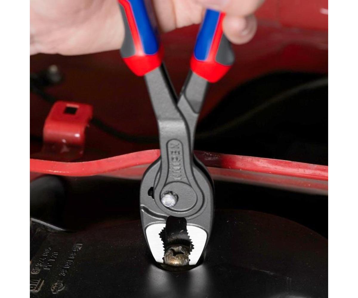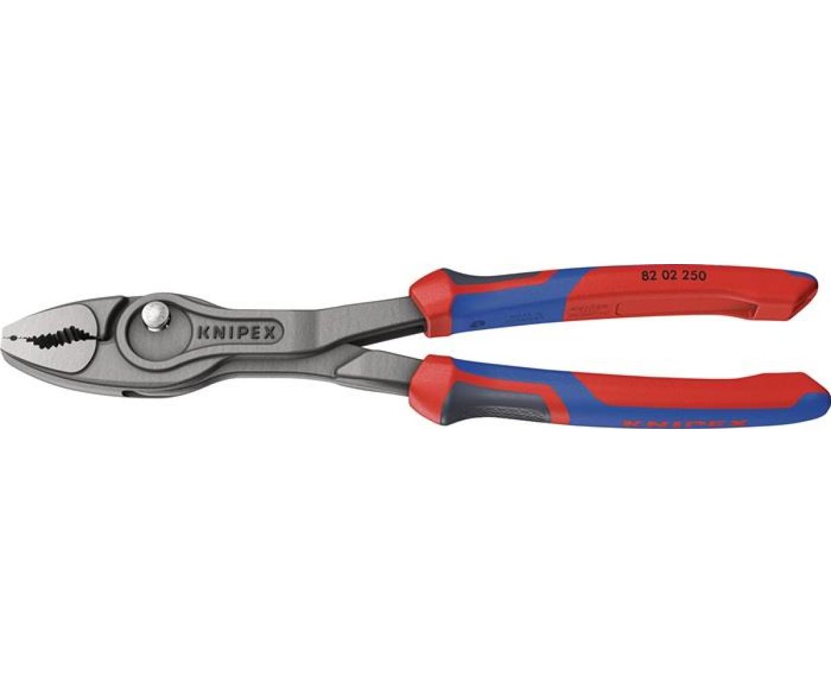 82 02 250 KNIPEX TwinGrip® Greifen · Anziehen und Lösen von Schrauben mit verschlissenen Köpfen und Antrieben. Einzigartige Kombination: Frontgreif- und Seitengreif-Funktion · durchgestecktes Gelenk · Druckknopfverstellung. Bissiges Frontgreifmaul mit robusten Zähnen und hoher Übersetzung an der Maulspitze. Sehr schlanke und kompakte Zange: filigranes Arbeiten auch in beengten Bauräumen · mit schlanker Drehzone für schnelles Schrauben. Große Front- und Seitengreif-Kapazitäten: für Durchmesser und Schlüsselweiten 5 – 27 mm. Zuverlässiges · frontales Greifen flacher Werkstücke bis 10 mm durch Dreipunkt-Anlage. Siebenfach verstellbares Gleitgelenk mit Druckknopfverstellung für präzises Anpassen der Greifweite. Klemmschutz mindert das Risiko gequetschter Finger. Langlebig und belastbar durch robustes · durchgestecktes Zangengelenk. Greift kraftvoll auch große · sehr fest- und tiefsitzende Bauteile mit SW 5 - 27 mm. Mit Comfort-Griffen: aus drei ergonomischen Komponenten für optimierte Handhabung und mit zwei KNIPEXtend-Schnittstellen für Erweiterungen. - Einstellpositionen: 7 - Kapazität für Rohre (Durchmesser): Ø 1/16 – 13/64in - Kapazität für Rohre (Durchmesser): Ø 5 – 27mm - Kapazität für Muttern · Schlüsselweite (mm): 5 – 27mm - Kapazität für Muttern · Schlüsselweite (Zoll): 13/64 – 1/16in