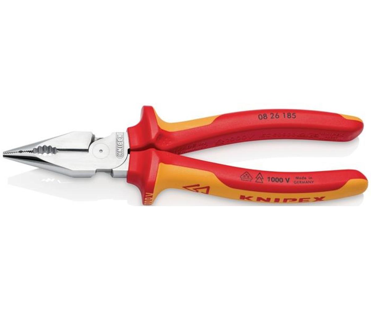 Weitere technische Eigenschaften · Zange: verchromt · Facette: Schneide mit Facette · Gewicht: 213g · Oberfläche: verchromt · Schneidwert Cu-Kabel, mehrdrähtig: 25mm · Spitzkombizange L.185mm · pol.Mehrkomp.-Hülle · verchr.VDE KNIPEX ·
