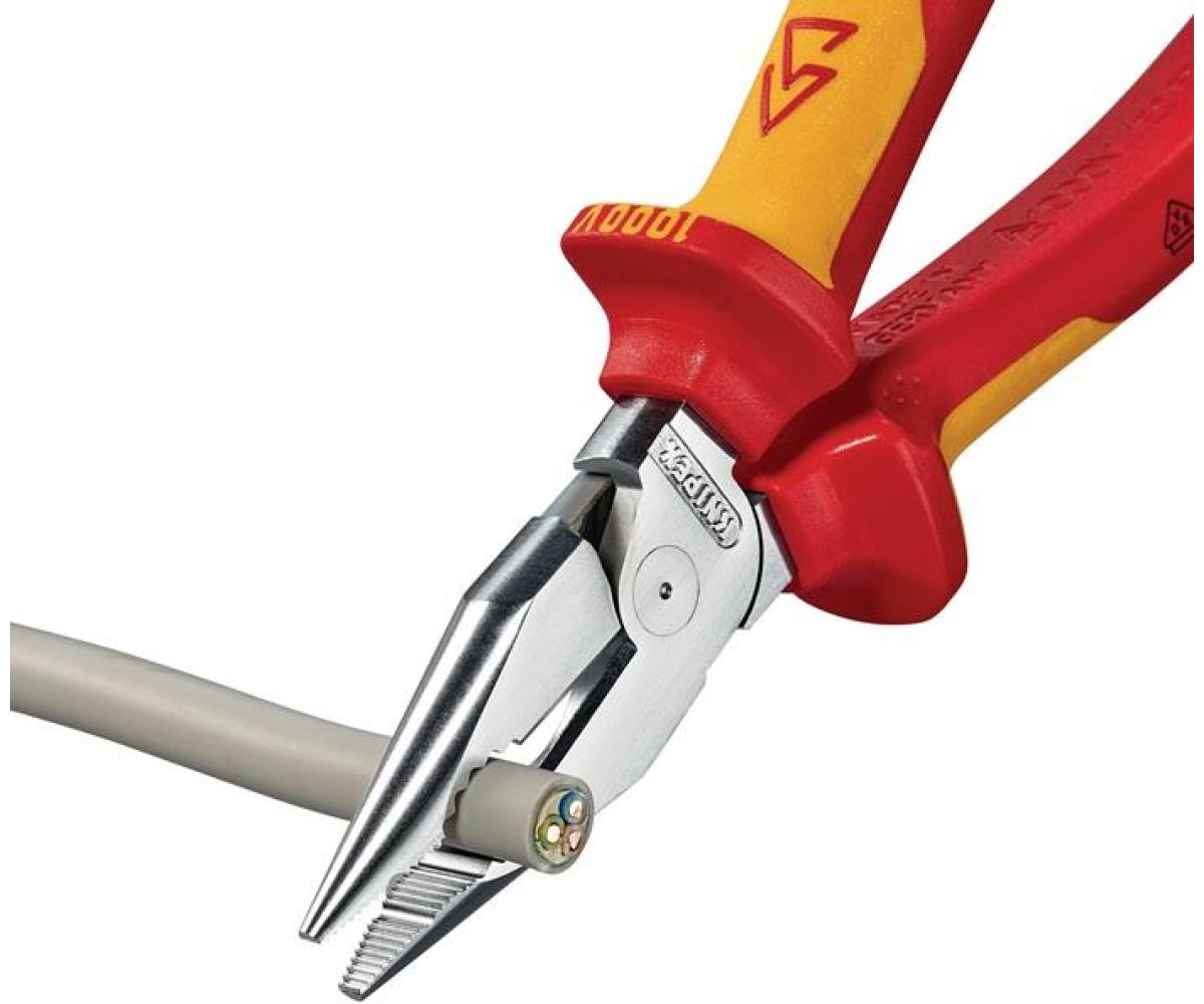 VDE-isoliert bis 1000 V · gefertigt gem. DIN EN/IEC 60900, stückgeprüft · Greifzonen für Flach- und Rundmaterial · leichtes Schneiden dank hochübersetztem Kraftgelenk · lange Schneidkanten für dickere Kabel · Spezial-Werkzeugstahl in Sondergüte, mehrstufig ölgehärtet Zange verchromt