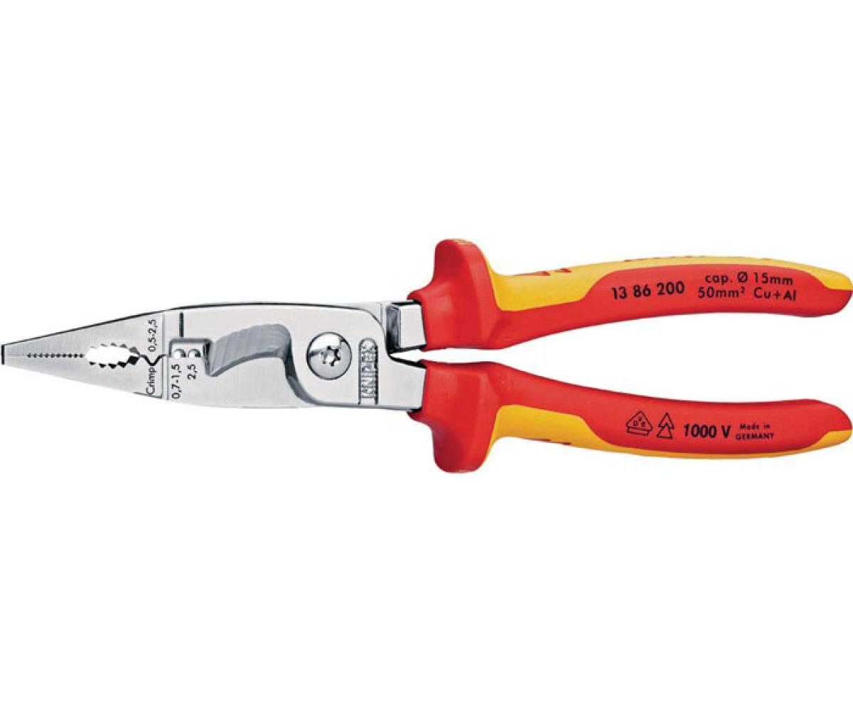 VDE-isoliert bis 1000 V · gefertigt gem. DIN EN/IEC 60900, stückgeprüft · für die Elektroinstallation · zum Greifen von Flach- und Rundmaterial, Biegen, Entgraten, Kabelschneiden, Abisolieren und Crimpen von Aderendhülsen · schlanke Bauform für gute Zugänglichkeit · Spezial-Werkzeugstahl in Sondergüte, geschmiedet, mehrstufig ölgehärtet Zange verchromt