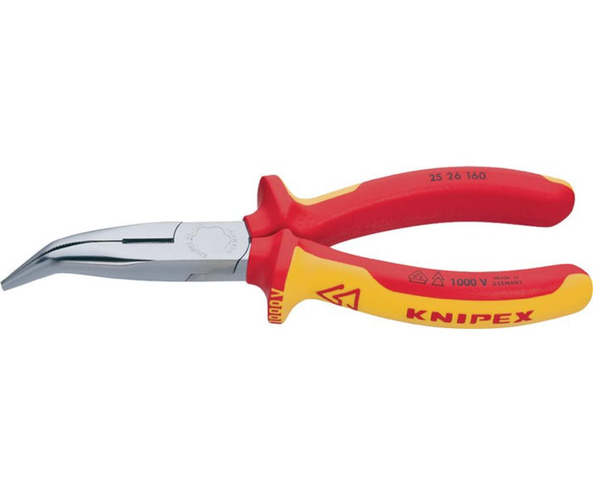mit Schneide (Storchenschnabelzange) · VDE-isoliert bis 1000 V · gefertigt gem. DIN EN/IEC 60900, stückgeprüft · 40° abgewinkelte, flachrunde, lange, spitz zulaufende Backen · Greifflächen gezahnt · verwindungstolerante, elastische Präzisionsspitzen · Schneiden zusätzlich gehärtet, Schneidenhärte ca. 61 HRC · Vanadin-Elektrostahl, geschmiedet, mehrstufig ölgehärtet mit Befestigungsöse zum Anbringen einer Absturzsicherung
