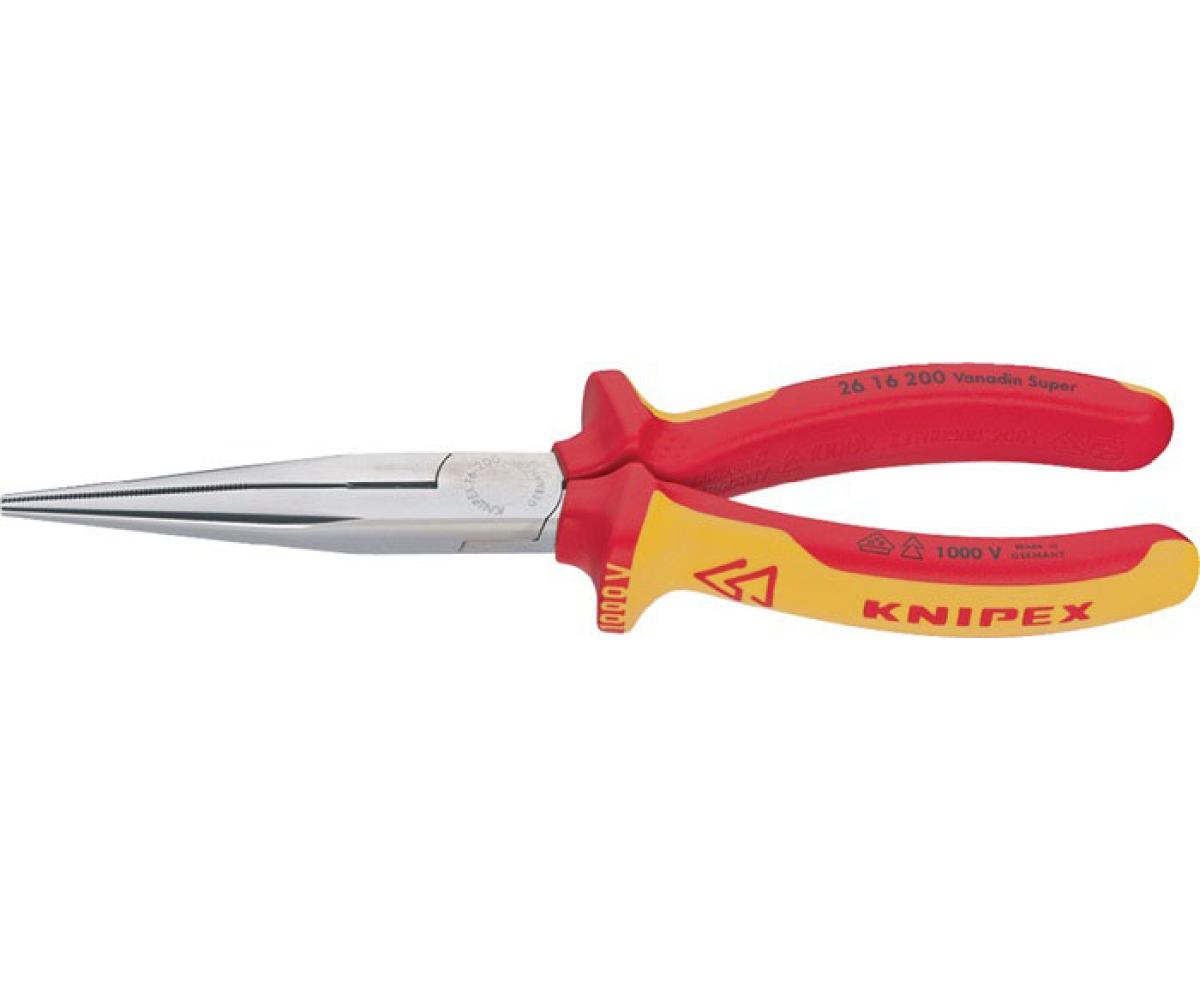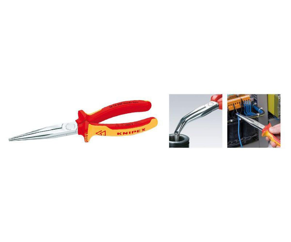 mit Schneide (Storchenschnabelzange) · VDE-isoliert bis 1000 V · gefertigt gem. DIN EN/IEC 60900, stückgeprüft · gerade, flachrunde, lange, spitz zulaufende Backen · Greifflächen gezahnt · verwindungstolerante, elastische Präzisionsspitzen · Schneiden zusätzlich gehärtet, Schneidenhärte ca. 61 HRC · Vanadin-Elektrostahl, geschmiedet, mehrstufig ölgehärtet Zange verchromt