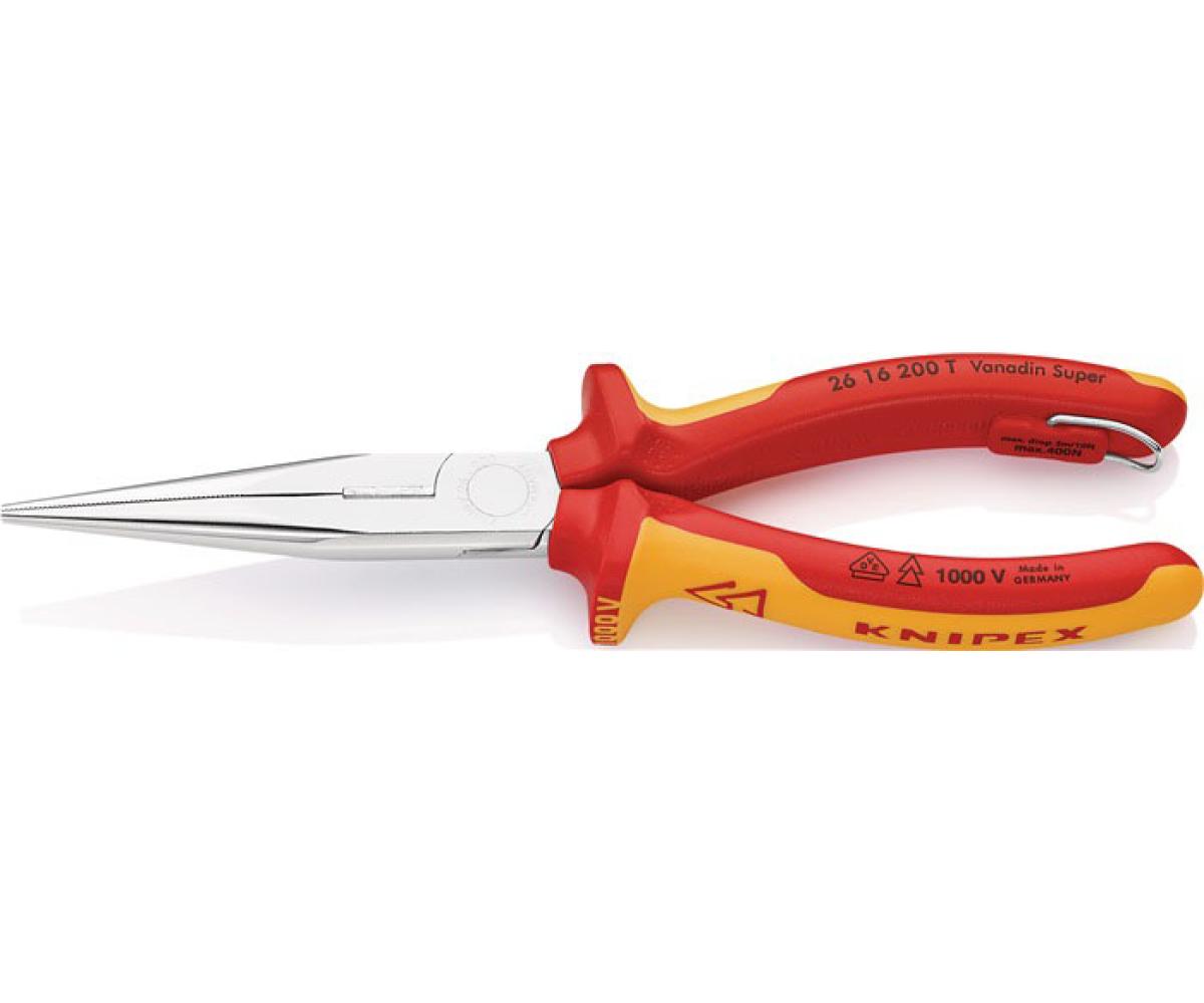 mit Schneide (Storchenschnabelzange) · VDE-isoliert bis 1000 V · gefertigt gem. DIN EN/IEC 60900, stückgeprüft · gerade, flachrunde, lange, spitz zulaufende Backen · Greifflächen gezahnt · verwindungstolerante, elastische Präzisionsspitzen · Schneiden zusätzlich gehärtet, Schneidenhärte ca. 61 HRC · Vanadin-Elektrostahl, geschmiedet, mehrstufig ölgehärtet Zange verchromt mit integrierter isolierter Befestigungsöse zum Anbringen einer Absturzsicherung
