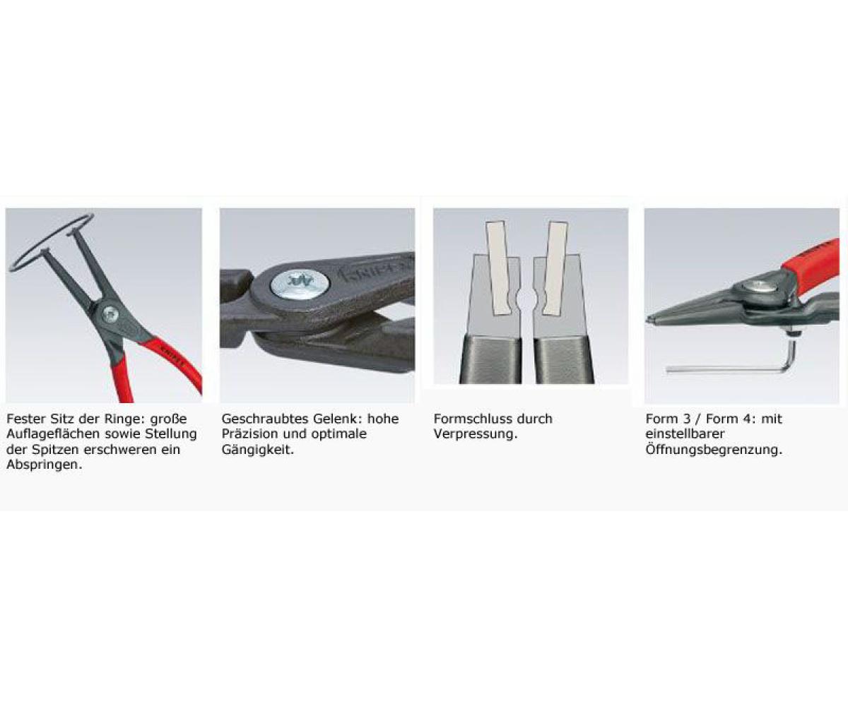 für Außenringe · 90° gewinkelte Spitzen · keine Verwindung der Ringe · leichte Montage · eingesetzte Spitzen aus gezogenem Federstahldraht für sicheres Arbeiten · bis zu 10-fach höhere Standzeit gegenüber angedrehten Spitzen · Chrom-Vanadin-Elektrostahl, geschmiedet, ölgehärtet Zange grau atramentiert · Griffe mit Kunststoffüberzug