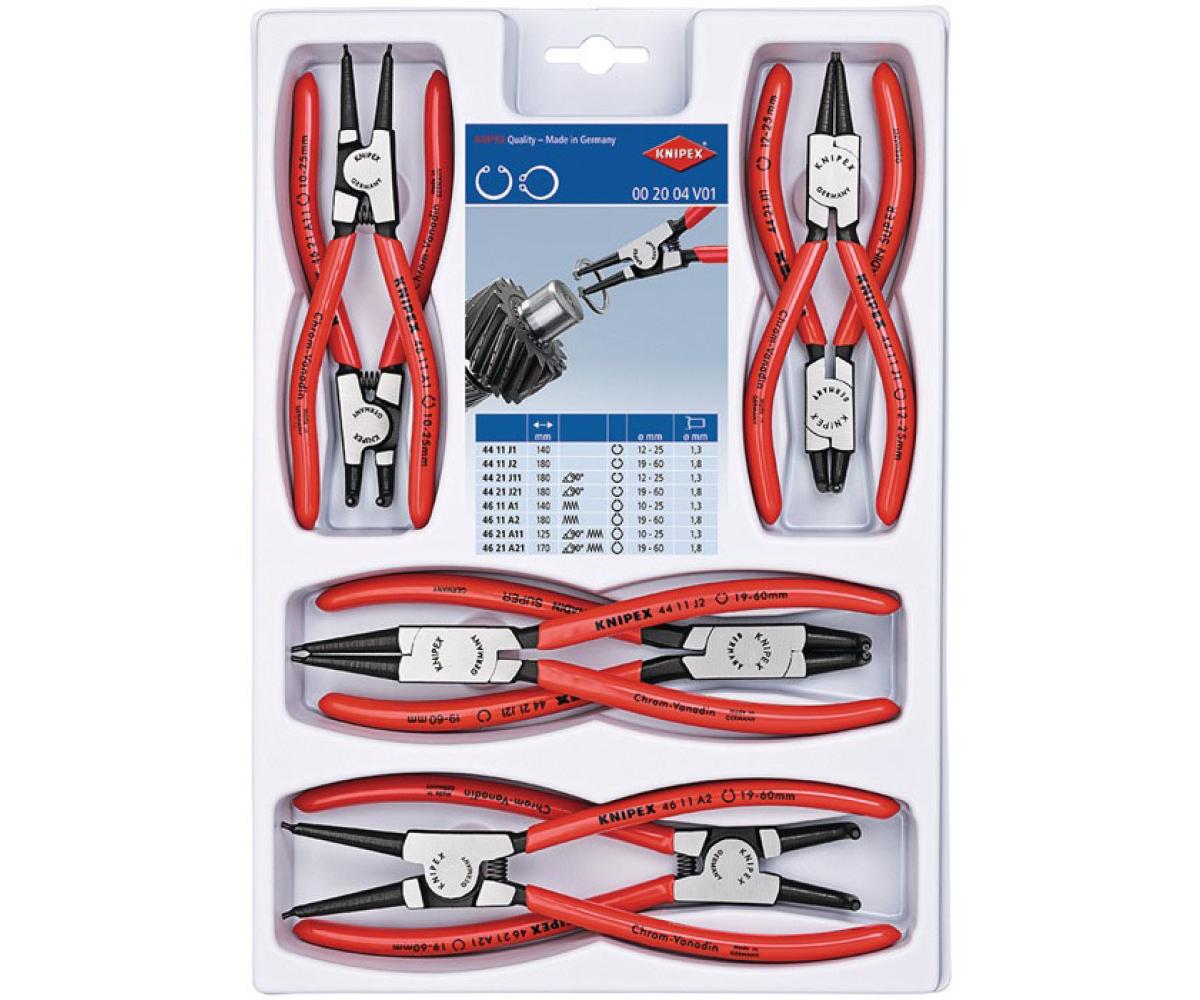 Inhalt: 1 St. Sicherungsringzange für Innenringe, gerade 12 - 25 mm Ø (Art.-Nr. 4000 810 531) 1 St. Sicherungsringzange für Innenringe, gerade 19 - 60 mm Ø (Art.-Nr. 4000 810 532) 1 St. Sicherungsringzange für Außenringe, gerade 10 - 25 mm Ø (Art.-Nr. 4000 810 551) 1 St. Sicherungsringzange für Außenringe, gerade 19 - 60 mm Ø (Art.-Nr. 4000 810 552) 1 St. Sicherungsringzange für Innenringe, 90° gewinkelt, 12 - 25 mm Ø (Art.-Nr. 4000 810 541) 1 St. Sicherungsringzange für Innenringe, 90° gewinkelt, 19 - 60 mm Ø (Art.-Nr. 4000 810 542) 1 St. Sicherungsringzange für Außenringe, 90° gewinkelt, 10 - 25 mm Ø (Art.-Nr. 4000 810 561) 1 St. Sicherungsringzange für Außenringe, 90° gewinkelt, 19 - 60 mm Ø (Art.-Nr. 4000 810 562)