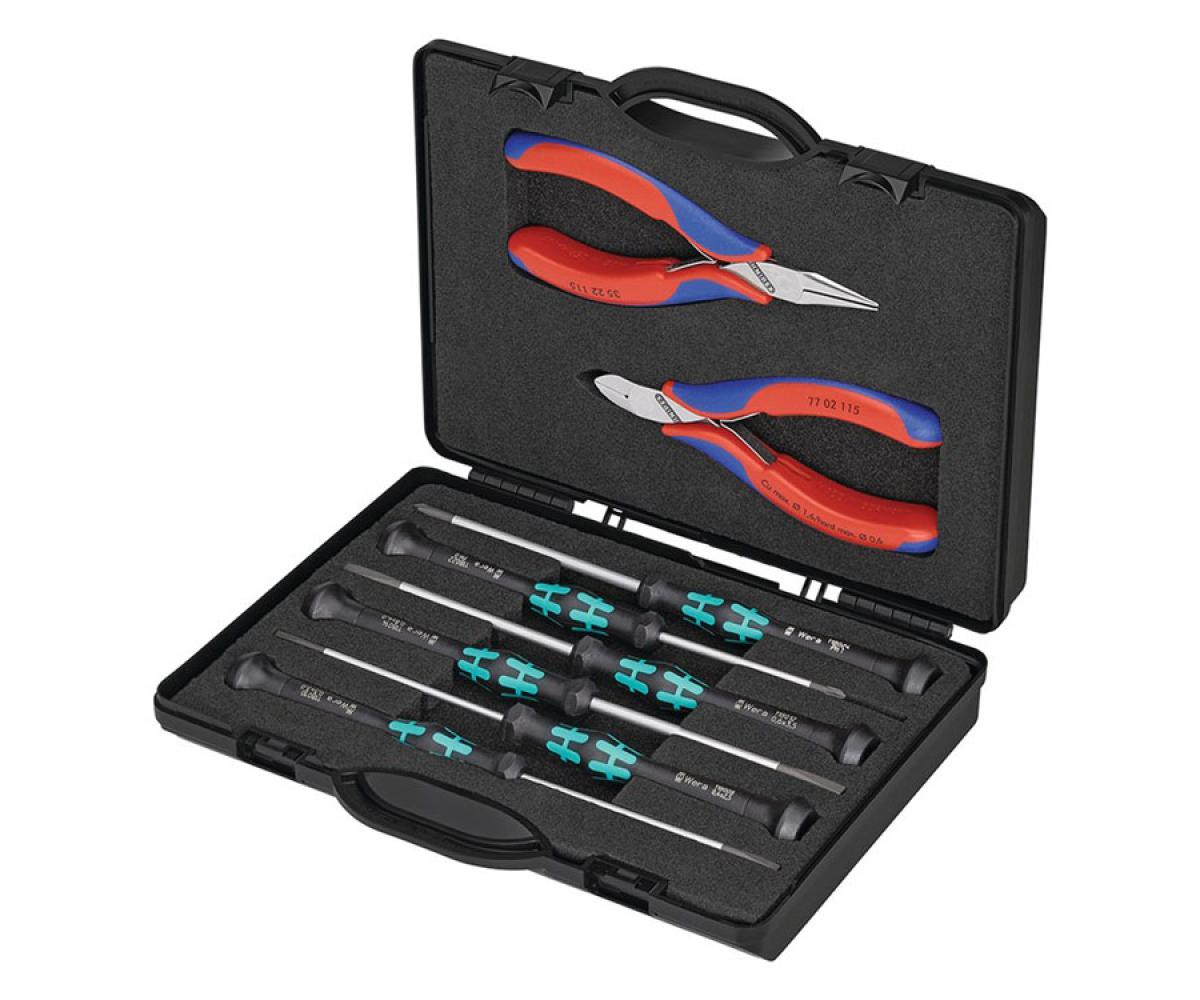 für Arbeiten an elektronischen Bauteilen Inhalt: 1 Elektronik-Greifzange 115 mm, mit Öffnungsfeder, flache, runde Backen, durchgestecktes Gelenk 1 Elektronik-Seitenschneider 115 mm, mit kleiner Facette, Öffnungsfeder, durchgestecktes Gelenk je 1 Feinmechanik-Schraubendreher für Schlitzschrauben Gr. 0,4 x 2,5 / 0,5 x 3,0 / 0,6 x 3,5 / 0,8 x 4,0 mm 1 Feinmechanik-Schraubendreher für Schrauben mit Kreuzschlitz (PH) Gr. 0 1 Feinmechanik-Schraubendreher für Schrauben mit Kreuzschlitz (PZD/Supadriv) Gr. 1
