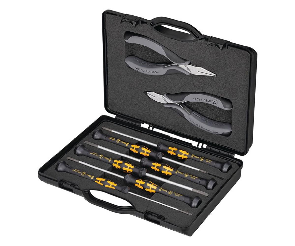 Elektronikwerkzeugsatz · ESD 8tlg.KNIPEX · Inhalt: 1 St. Elektronik-Greifzange ESD flach-runde Backen, elektrisch ableitend, dissipativ (Art.-Nr. 4000 810 744) 1 St. Elektronik-Seitenschneider ESD runder Kopf, mit kleiner Facette, elektrisch ableitend, dissipativ (Art.-Nr. 4000 810 745) Schneidwerte: weicher Draht: 0,3 - 1,6 mm Ø mittelharter Draht: 1,2mm Ø harter Draht: 0,5 mm Ø je 1 St. ESD Schraubendreher für Schlitzschrauben 0,4 x 2,5 mm, 0,5 x 3 mm, 0,6 x 3,5 mm, 0,8 x 4,0 mm je 1 St. Schraubendreher ESD für Schrauben mit Kreuzschlitz (PH) Größe 0, 1 Lieferung in praktischer Aufbewahrungsbox aus schlagfestem Kunststoff mit Schaumstoffeinlagen ·