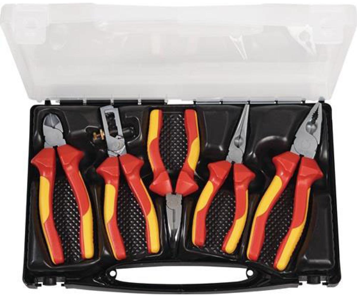 Inhalt: 1 St. Radio-/Telefonzange 160 mm, gerade (Art.-Nr. 4000 810 328) 1 St. Storchenschnabelzange 160 mm, gebogen (Art.-Nr. 4000 810 873) 1 St. Seitenschneider 160 mm (Art.-Nr. 4000 810 158) 1 St. Abisolierzange 160 mm (Art.-Nr. 4000 810 418) 1 St. Kombizange 180 mm (Art.-Nr. 4000 810 241) Lieferung im hochwertigen KunststoffkofferTechnische Daten