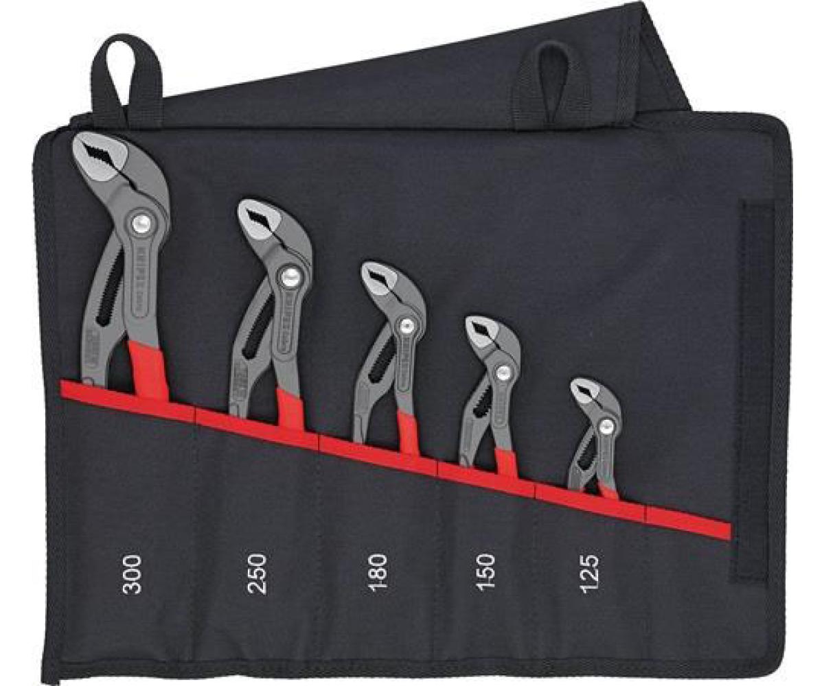 Chrom-Vanadium-Stahl · selbstklemmend an Rohren und Muttern · durchgestecktes Gelenk · Schnellverstellung per Knopfdruck · einer Rolltasche aus strapazierfähigem Polyestergewebe · mit Klettverschluss bestehend aus: Wasserpumpenzange 1 x Art.-Nr. 4000 810 658, L. 125 mm 1 x Art.-Nr. 4000 810 697, L. 150 mm 1 x Art.-Nr. 4000 810 673, L. 180 mm 1 x Art.-Nr. 4000 810 674, L. 250 mm 1 x Art.-Nr. 4000 810 675, L. 300 mm