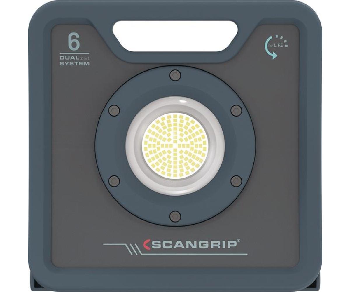 wiederaufladbare LED-Arbeitsleuchte mit 4000 Lumen · tragbar · kann mit oder ohne 5 m Gummikabel verwendet werden · wasser- und staubdicht (IP67) · mit einem integriertem Tragegriff und einer flexiblen Halterung für den einfachen Transport und zur Montage an einem SCANGRIP TRIPOD Stativ · mit 90 LEDs · einstellbare Lichtleistung · separate Anzeigen für Restlaufzeit und Batteriestand