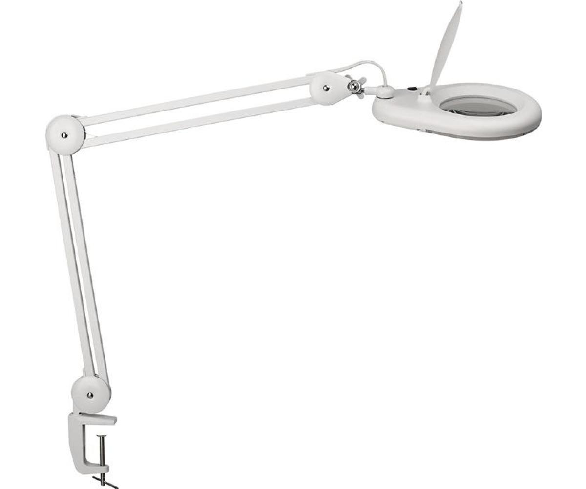 LED-Lupenleuchte · Glaslinse 127mm (5 Zoll) · Tischklemme weiß