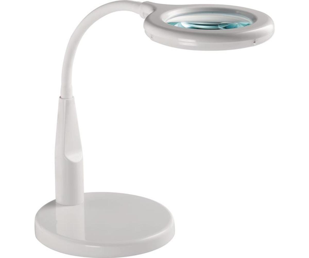 Kunststoff · mit Standfuß · runder Kopf · Glaslinse 88,9 mm (3,5”) 3 Dioptrien, mit eingelassenem Auge 12 Dioptrien · Betriebsspannung 230 V · Lichtfarbe 6.300 Kelvin - tageslichtweiß · Lichtstrom 420 Lumen · Lebensdauer 30.000 Stunden · Effizienzklasse E (Spektrum A bis G) · diese Leuchte enthält eingebaute LED-Lampen · die Lampen können nicht ausgetauscht werden