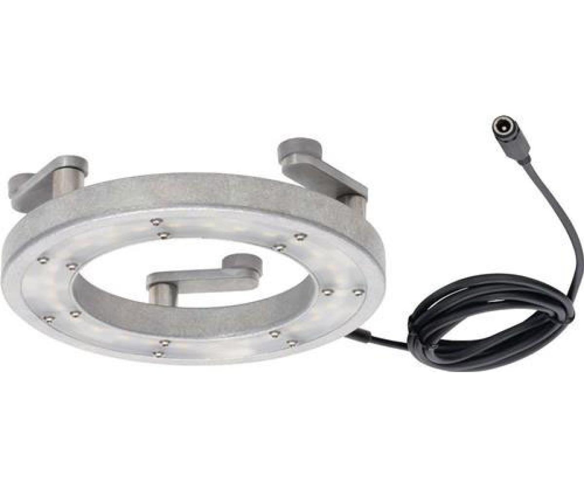 Hochleistungs-LED im Aluminium-Gehäuse, wasserdicht · 360° gleichmäßige Ausleuchtung, blend- und flackerfrei, reflexionsarm · Anschluss an 24 Volt Maschinensteuerung oder mit Netzteil 24 Volt · wasserdicht nach IP67 bis Netzteilkupplung · Maße 160 (außen) x 100 (innen) x 42 mm · für schattenfreie Ausleuchtung von drehenden Spindelköpfen an z.B. Bohr- und Fräsmaschinen · „Made in Germany“ · einstellbare, gummiummantelte Magnetfüße