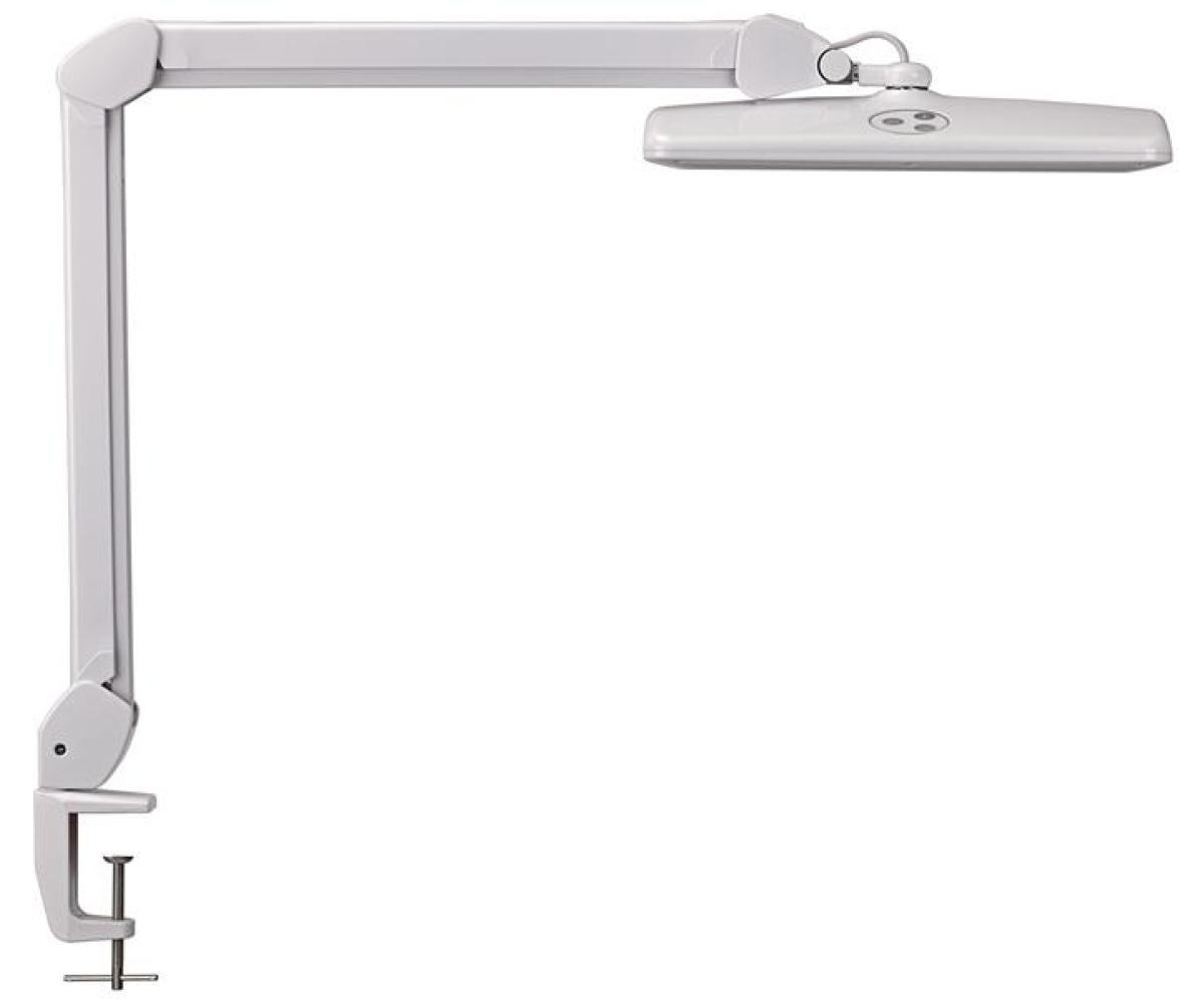 Schreibtischleuchte Metall/Kunststoff · mit Tischklemme oder Standfuß · stufenlos dimmbar - Diffusor für geringen Schattenwurf · Dreidimensional verstellbarer Leuchtenkopf · Armlänge unten 400 mm - oben 440 mm - Höhe max. 515 mm (mit Tischklemme) · Armlänge unten/oben 295 mm - Höhe max. 460 mm (mit Standfuß) · Betriebsspannung 220-240 V · Lichtfarbe 6.500 Kelvin - tageslichtweiß · Lebensdauer 20.000 Stunden · Lichtstrom 1.449 Lumen · gewichteter Energieverbrauch 11 kWh/1000h · Effizienzklasse E (Spektrum A bis G)
