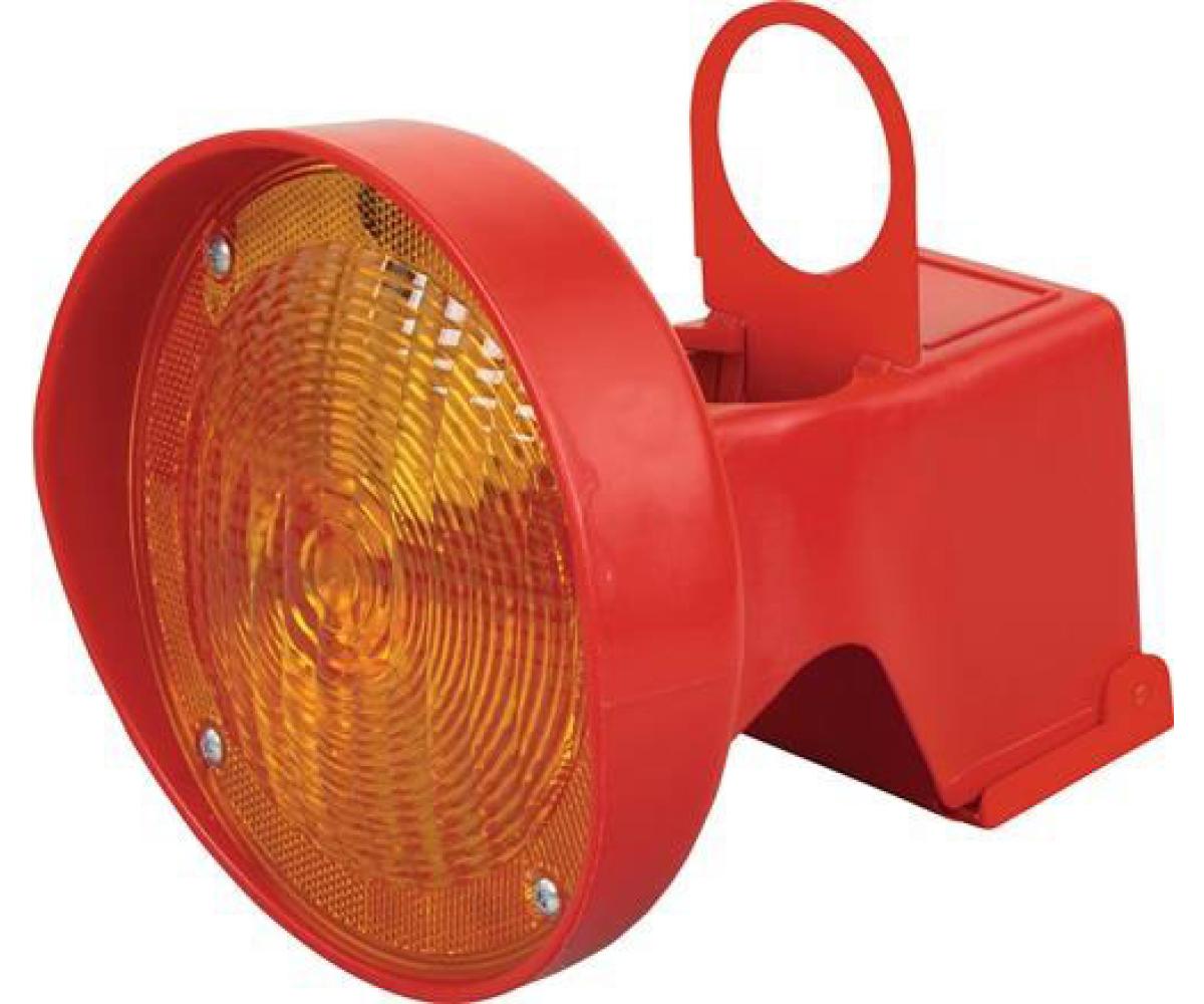 Schnellmontage mit Automatikschalter · automatisches An- und Ausschalten durch Aufsetzen oder Abnehmen der Lampe · Linsendurchmesser 180 mm · LED- und Linsenfarbe: verkehrsgelb · Gehäusefarbe: rot · betrieben mit 1 x 4R25 6-V Blockbatterie (nicht im Lieferumfang enthalten!)