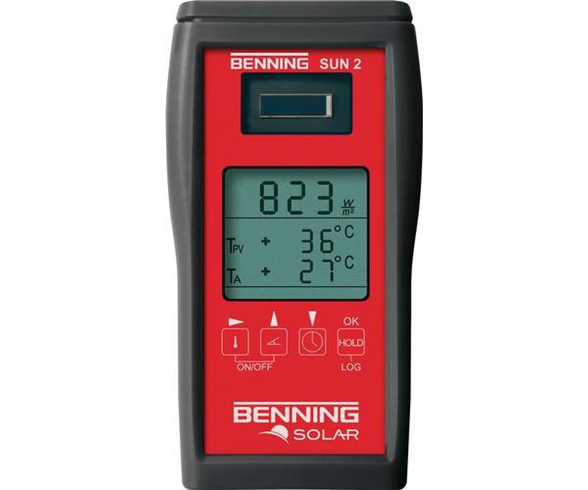 Messung der solaren Einstrahlung (W/m²) über PV-Referenzzelle · PV-Modultemperatur und Umgebungstemperatur (°C) · digitaler Kompass und Neigungswinkelmesser · bei Funkübertragung (433 MHz) zu BENNING PV 1-1+ werden die aktuellen Einstrahlungs- und Temperaturwerte zum Messergebnis gespeichert · Datenlogger (5000 Datensätze), bestehend aus solare Einstrahlung und Modul-/Umgebungstemperatur · integrierte Echtzeituhr mit Datum-/Zeitstempel · USB-Schnittstelle und Download-Software zur Prüfprotokollerstellung in MS Excel®