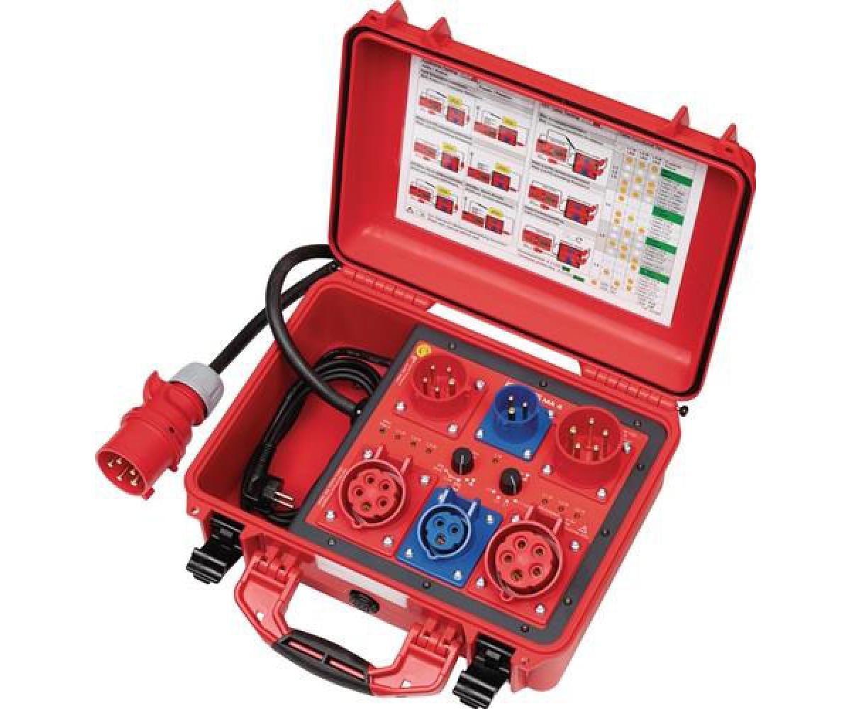 für die aktive und passive Prüfung von 1- und 3-phasigen Geräten (inkl. Schweißgeräte), sowie Verlängerungsleitungen · passend für die Gerätetester BENNING ST 725, ST 750 A, ST 755, ST 755+, ST 760 und ST 760+ · Anschluss für Prüflinge mit CEE 16 A/230 V, CEE 16 A/400 V und VEE 32 A/400 V Stecker · Messadapter kann mit 32 A voll belastet werden · unterstützte Messungen: RPE Schutzleiterwiderstand, RISO Isolationswiderstand, IDiff. Differenzstrom, IEA Ersatzableitstrom, Auslösezeit und Auslösestrom von PRCDs · Betriebsmittel- und Kabel-Funktionsprüfung inkl. Leitungsbruch-, Kurzschluss- und Drehfeldprüfung · Drehschalter "Funktion"zur Betriebsmittelwahl: Elektrisches Gerät oder Verlängerungsleitung (Kabel) · Drehschalter "Kabel": Aufschaltung aller oder einzelner Phasen zur detaillierten Kabelprüfung · Eigentest: Bewusste Zuschaltung eines Gerätefehlerstroms (1 mA / 3 mA) zur Prüfung des gesamten Testsystems · 7 Status-LED's und 1 Netz-LED · robuster und staub-/wasserdichter Schutzkoffer IP 67