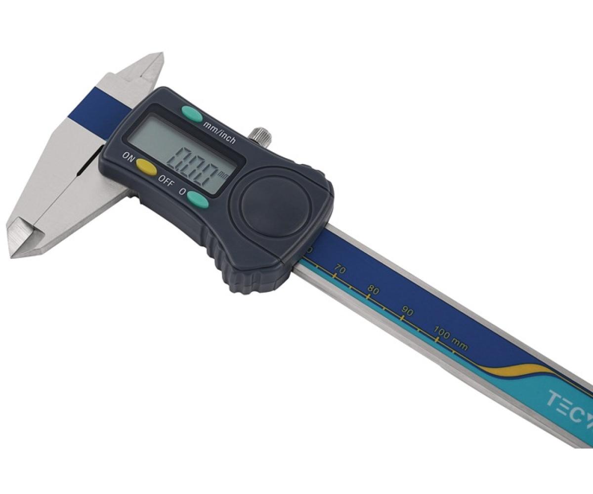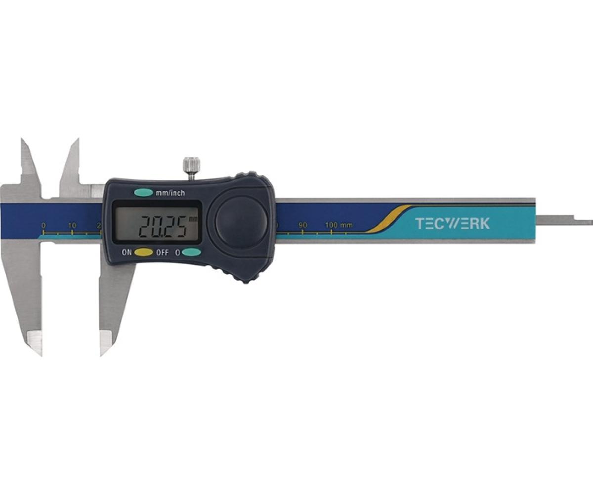 digital · gut ablesbar · Ziffernhöhe 8 mm · das kapazitive Messsystem liegt geschützt gegen Schmutz und Beschädigungen in der Messschiene · Schiene, Schnäbel und Spitzen gehärtet · Batterie-Kontrollanzeige · für Innen-, Außen- und Tiefenmessung · mit Feststellschraube · Nullpunktsetzung an jeder Stelle · Elektronik schaltet nach ca. 5 Minuten nach Nichtgebrauch eigenständig ab