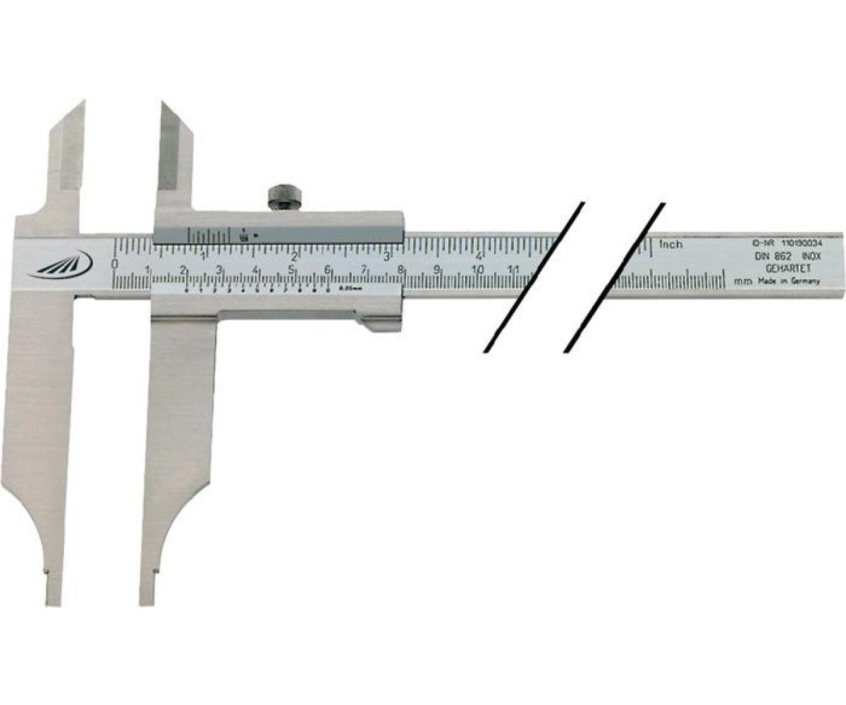 mit Messerspitzen · Skala und Nonius mattverchromt · Teilung und Skalierung hochgenau durch Laserbeschriftung · Hauptteilung tiefergelegt · Innen- und Außenmessung Lochmaßansatz für Innenmessungen: bis 300 mm Messbereich = 10 mm 500 - 1000 mm Messbereich = 20 mm