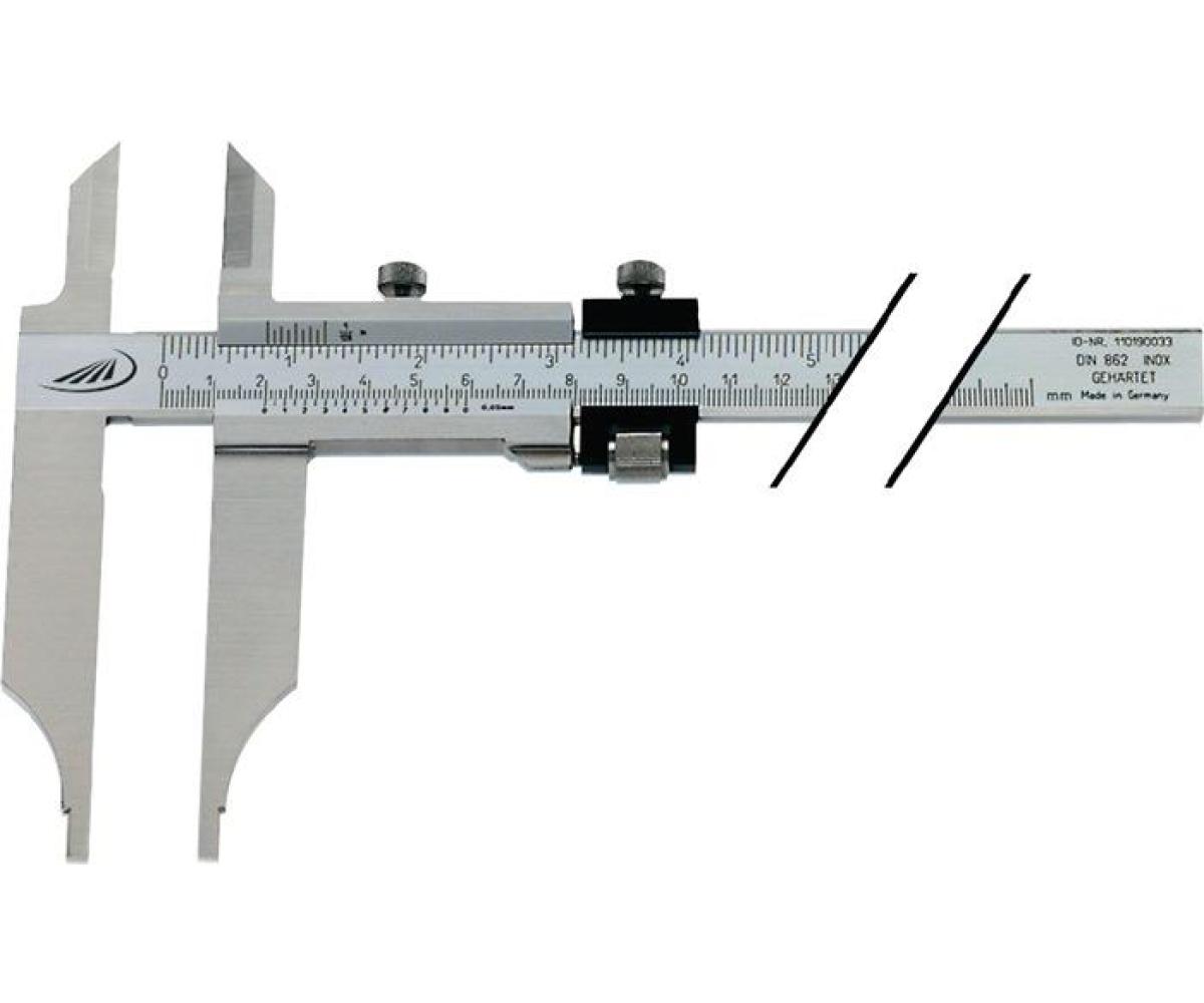 mit Messerspitzen · Skala und Nonius mattverchromt · Teilung und Skalierung hochgenau durch Laserbeschriftung · Hauptteilung tiefergelegt · Innen- und Außenmessung Lochmaßansatz für Innenmessungen: bis 300 mm Messbereich = 10 mm 500 - 1000 mm Messbereich = 20 mm