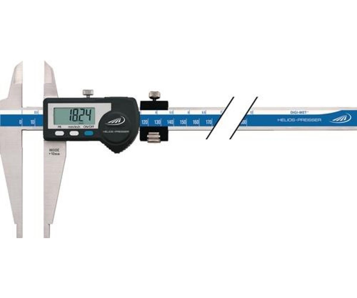 digital · induktives Messsystem, resistent gegen Feuchtigkeit und Handschweiß · mit Feststellschraube und Messerspitzen Funktionen: Ein-/ Ausschaltung · QuickStart-Elektronik · QuickLock-Funktion für einmaliges Nullsetzen und Tastensperre gegen unbeabsichtigte Tastenbetätigung · Nullpunktsetzung an jeder Stelle · mit variablem Datenausgang USB, RS 232, Digimatic · PRESET-Funktion (Messwertvoreinstellung) LCD-Anzeige 300 mm = 8,5 mm ab 500 mm = 12,5 mm Lochmaßansatz für Innenmessungen: 300 mm Messbereich = 10 mm ab 500 mm Messbereich = 20 mm