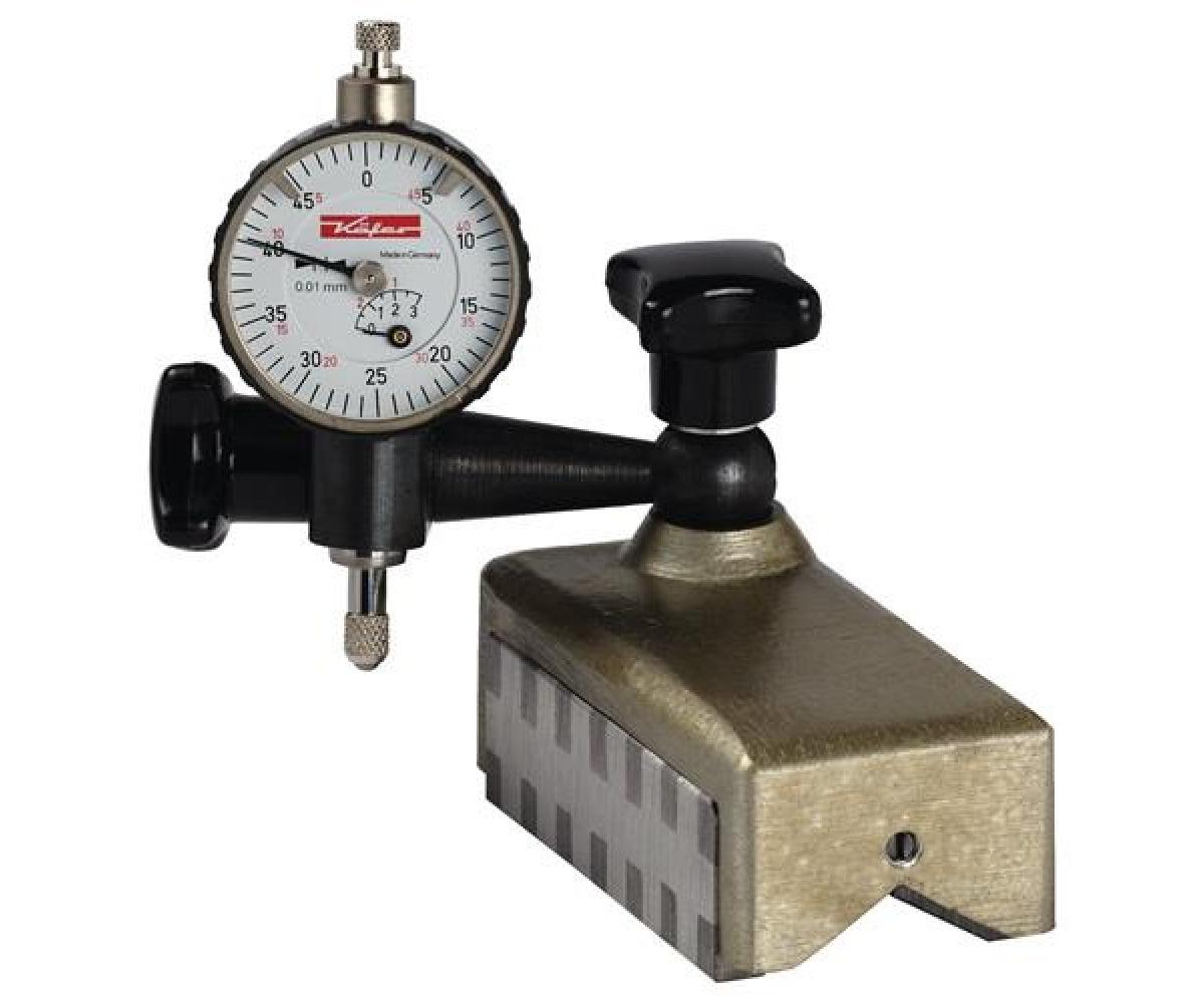 für Messuhren · die Messuhr ist universell in jeder Lage einsetzbar · es sind zusätzliche Haftflächen an beiden Längsseiten vorhanden · die prismatische Sohle gestattet auch ein Aufsetzen auf Wellen · die Magnetkraft ist besonders hoch · Haftkraft 180 N · Messuhraufnahme 8 mm H7