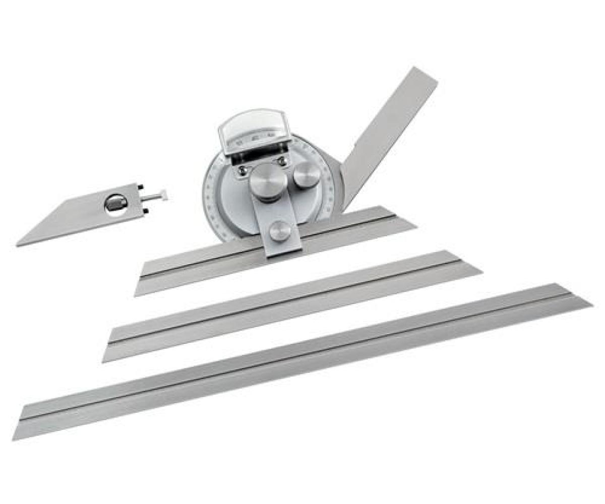 mit in ganzer Länge verschiebbarer Messschiene · zum Messen der Winkelgrade an Werkstücken, Vorrichtungen und Maschinen · als Lineal, Kreuz- und Gehrungswinkel geeignet · Einteilung der Grundplatte in 4 x 90° · Ablesegenauigkeit 1/12° = 5 Bogenminuten · gehärtete Schiene · blendfrei mattverchromt