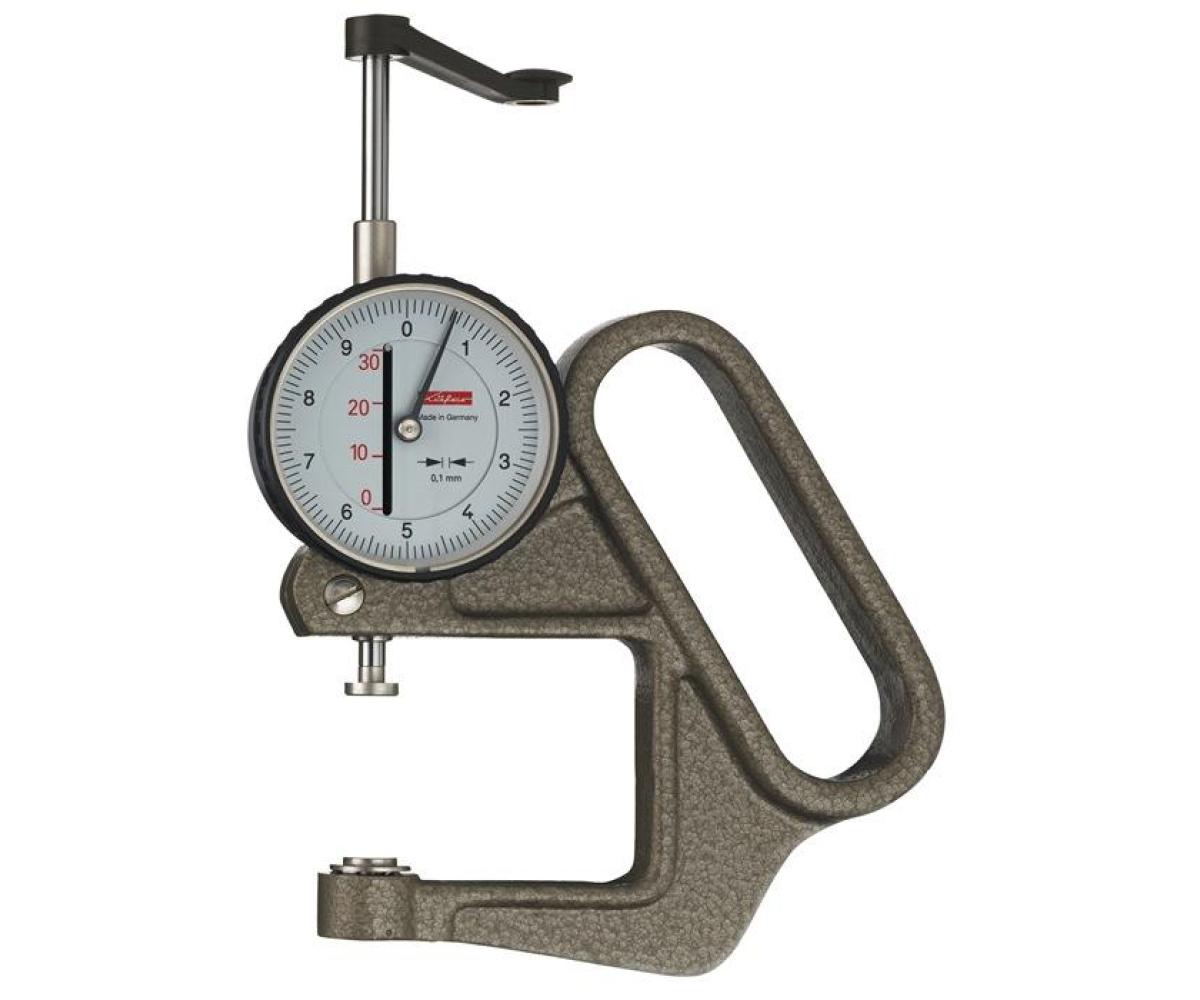 zum Messen der Dicke von Leder, Filz, Gummi, Glas, Blech, Sperrholz und Kunststoffen aller Art · durch Drehen des gerändelten Außenrings kann die Strichskala der Messuhr auf Null eingestellt werden · Bügeltiefe 50 mm, Außenring-Ø 58 mm