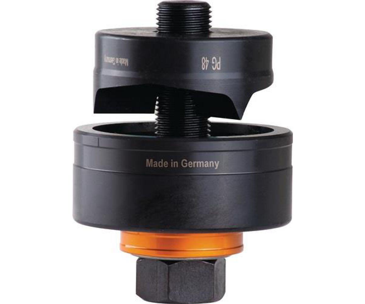 Spalt-Blechlocher · zum schnellen, gratfreien Stanzen von runden Löchern in Stahlbleche S235 · Materialstärke bis 3 mm · für Kabel-Verschraubungen mit PG- und metrische Gewinde und Sanitärarmaturen · durch 3-fach Spaltung kein verklemmen des Abfallstücks in der Matrize · Zugschraube mit UNF-Feingewinde · Bedienung der Zugschraube mittels Schraubenschlüssel · ideal für Schaltanlagenbauer, Elektriker, Installateure, Industrie und Handwerk · mit wenigen Handgriffen dünnwandige Materialien schnell, mühelos, sauber und gratfrei lochen