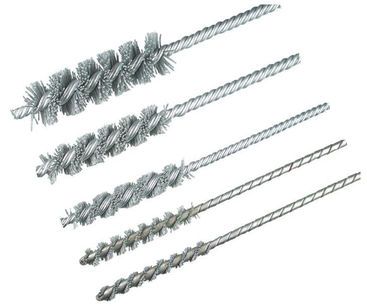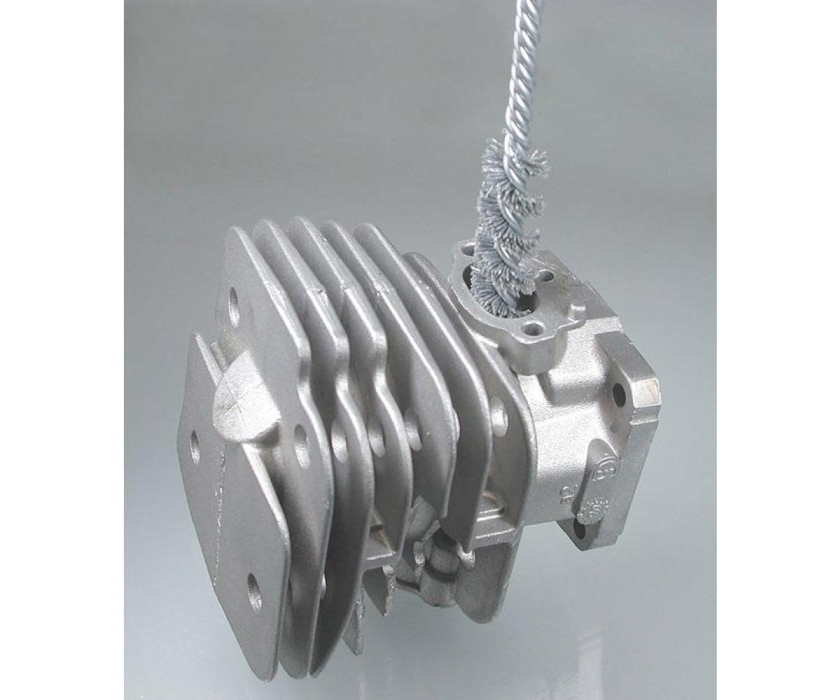 Besatzmaterial aus Siliciumcarbid · verzinkte, vierfache Drahtseele mit einfacher Besatzspirale · unentbehrliche Bürsten bei der Innenbearbeitung von NE-Metallen und Hydraulikguss · besonders geeignet zum Entgraten von Querbohrungen, Steuerteilen, O-Ring-Einstichen und zylindrischen Bohrungen an vielen Werkstücken · sowohl als Handwerkszeug als auch eingespannt in Handschleifern ergeben sich gute Arbeitsergebnisse