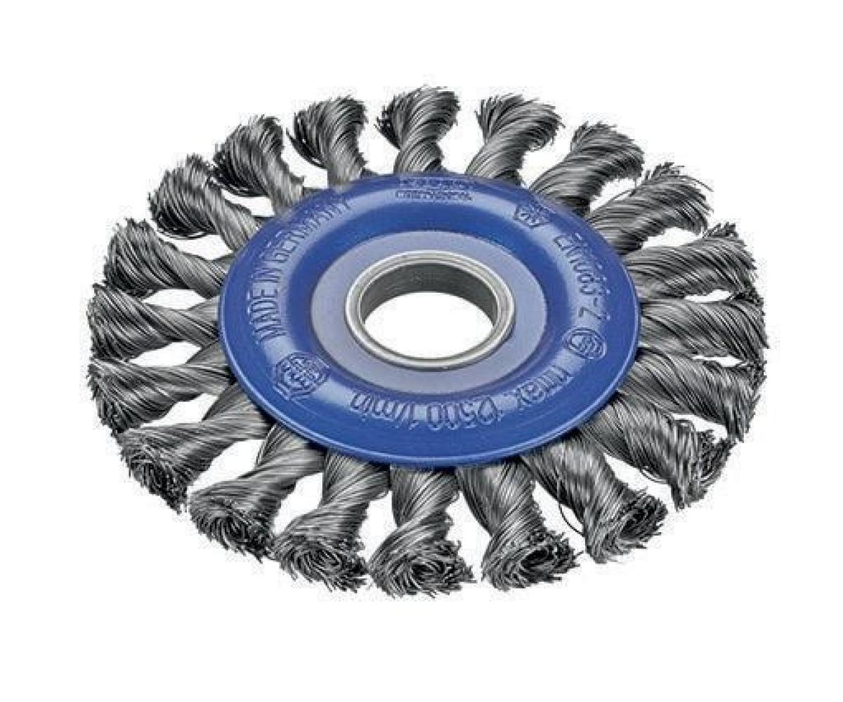 gezopfte Rundbürste in Industriequalität zur universellen Anwendung auf allen gängigen Winkelschleifern · aggressive und schnelle Reinigung · alle Drahtspitzen sind gleichzeitig im Einsatz · hohe Standzeit · TÜV-Süd zertifiziert (Sicherheit geprüft · Produktion überwacht) · zum Aufrauen, Entgraten und einfachen Entrostarbeiten Stahl, Edelstahl · Bohrung 22,2 mm Ø