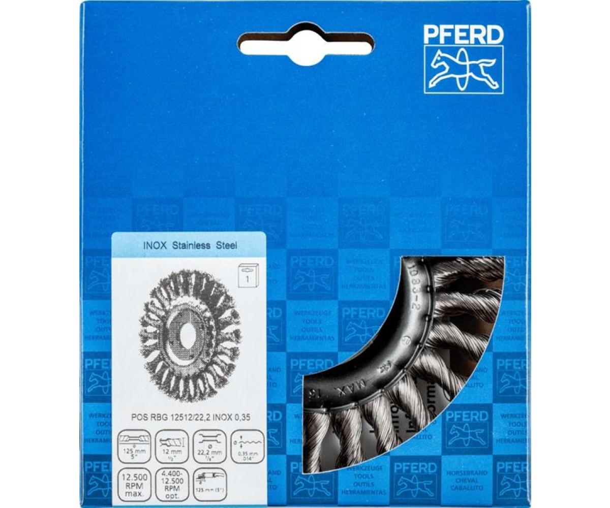 Weitere technische Eigenschaften · Antriebsart: Geradschleifer, Biegwellenantrieb, Winkelschleifer · Anwendungsempfehlung: Bitte beachten Sie die empfohlenen Drehzahlen. Für optimale Ergebnisse auf leistungsstarken Winkelschleifern einsetzen. · Anzahl, Zöpfe: 24Stück · Aufnahmesystem: Bohrung · Bearbeitbare Werkstoffe: Superlegierungen auf Nickel oder Titanbasis, Aluminium, Kobaltbasislegierungen, NE-Metall hart, Nickelbasislegierungen (z. B. Inconell und Hasteloy), Titanlegierungen, Bronze, Edelstahl (INOX), Weitere NE-Metalle, weiche Titanlegierungen (Zugfestigkeit 500 N/mm²), Hochwarmfeste Werkstoffe, Titan · Bearbeitungsaufgaben: Entzundern, Kehlnahtbearbeitung, Schweißnahtbearbeitung, Wurzelnahtbearbeitung, Entlacken, Anlauffarben entfernen, Reinigen, Entrosten, Entgraten, Oxydschichten entfernen · Besatzmaterial: Edelstahldraht (INOX) · Länge, Besatz: 28mm · Ø Besatzmaterial: 0,35mm · Ø Bohrung: 22,2mm · RPM, opt., bis: 12500RPM · RPM, opt., von: 4400RPM · Verpackungen: POS-Verpackung · Vorteile: Die Bürste ist entfettet und hinterlässt keine Ölrückstände auf dem Werkstück. Aggressiver Bürsteffekt durch hohe Steifigkeit der Drahtzöpfe. Sehr gute Korrosionsbeständigkeit. · RPM, max.: 12500RPM · Rundbürste POS RBG 12512 · D.125mm Drahtstärke · 0,35mm VA 12mm PFERD ·