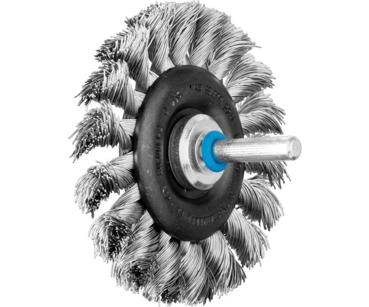 Weitere technische Eigenschaften · Antriebsarten: Biegwellenantrieb, Bohrmaschine, Geradschleifer · Anwendungsempfehlungen: Bitte beachten Sie die empfohlenen Drehzahlen., Für beste Leistung Werkzeugantrieb mit mindestens 500 Watt verwenden. · Bearbeitbare Werkstoffe: Aluminium, Bronze, Kobaltbasislegierungen, NE-Metall hart, Hochwarmfeste Werkstoffe, Nickelbasislegierungen (z. B. Inconell und Hasteloy), Superlegierungen auf Nickel oder Titanbasis, Weitere NE-Metalle, weiche Titanlegierungen (Zugfestigkeit 500 N/mm²), Edelstahl (INOX), Titan, Titanlegierungen · Bearbeitungsaufgaben: Reinigen, Entgraten, Entrosten, Entzundern, Anlauffarben entfernen, Oxydschichten entfernen, Entlacken, Wurzelnahtbearbeitung, Schweißnahtbearbeitung, Kehlnahtbearbeitung · Breite metrisch: 12mm · RPM, opt., bis: 16300min-1 · RPM, opt., von: 10000RPM · Sicherheitshinweise: Beim Einspannen der Bürste ist darauf zu achten, dass der Schaft möglichst weit in die Aufnahme eingespannt wird. Dies gilt insbesondere für den Einsatz im hohen Drehzahlbereich. Die Mindesteinspannlänge beträgt 10 mm. · Verpackungen: Industrieverpackung · Vorteile: Die Bürste ist entfettet und hinterlässt keine Ölrückstände auf dem Werkstück., Optimales Erreichen von schwer zugänglichen Stellen wie Nuten und Vertiefungen., Aggressiver Bürsteffekt durch hohe Steifigkeit der Drahtzöpfe., Sehr gute Korrosionsbeständigkeit. · Rundbürste RBG 7012/6 · INOX 0,35 D.76mm 6mm · Drahtstärke 0,35mm VA ·
