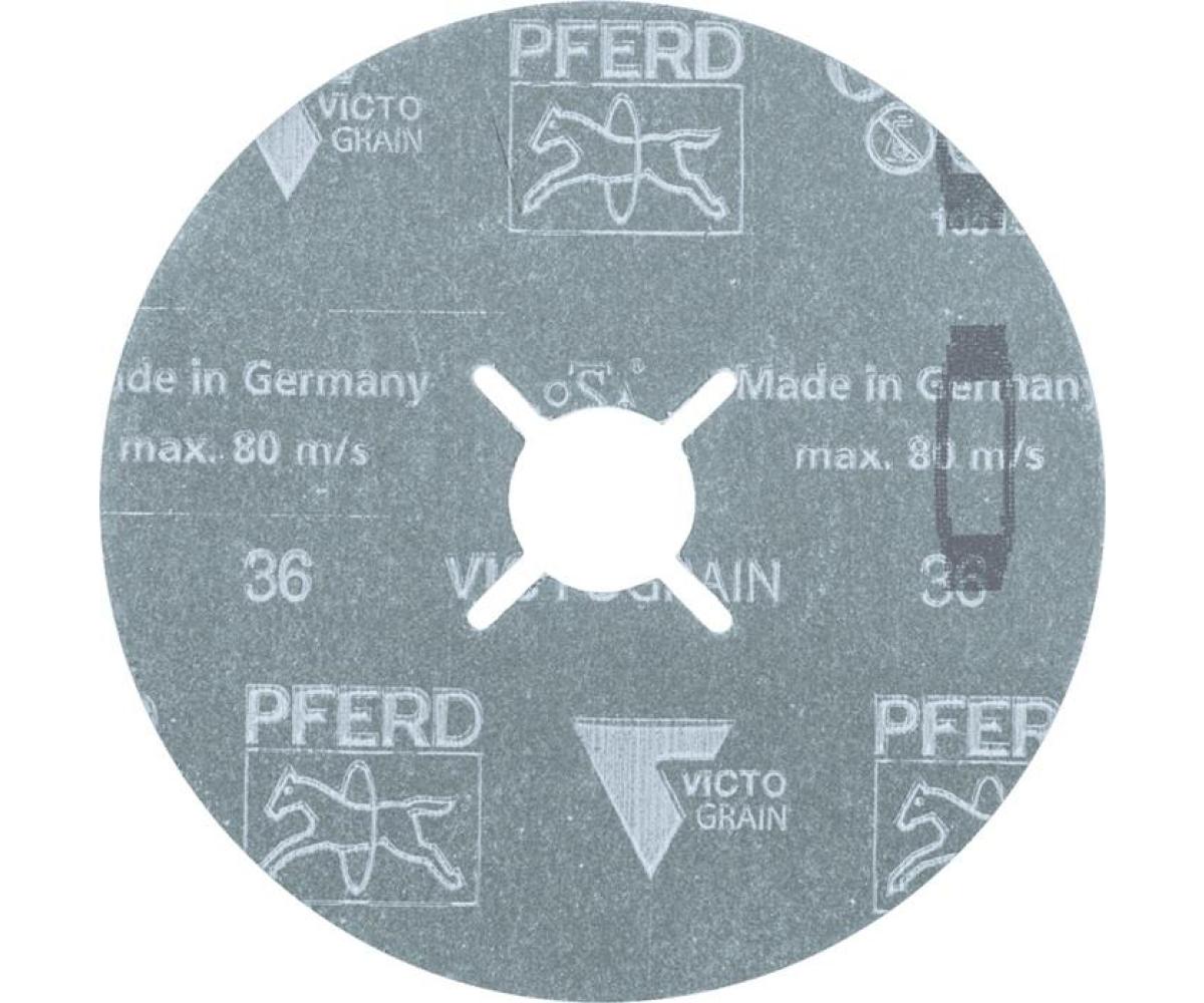Weitere technische Eigenschaften · Antriebsart: Akkuwinkelschleifer, Winkelschleifer · Anwendungsempfehlung: Für den Werkstoff geeignetes Schleiföl verwenden, um die Standzeit und Schleifleistung der Werkzeuge deutlich zu erhöhen. Fiberschleifer gemäß ISO 15636 mit Stützteller auf handelsüblichen Winkelschleifern einsetzen. · Bearbeitbare Werkstoffe: Stähle bis 1.200 N/mm² (< 38 HRC), NE-Metall hart, Gehärtete, vergütete Stähle über 1.200 N/mm² (< 38 HRC), Nickelbasislegierungen (z. B. Inconell und Hasteloy), Stahl, Stahl, Stahlguss, Stahlguss · Bearbeitungsaufgaben: Entgraten, Egalisieren, Flächenbearbeitung, Schweißnahtbearbeitung, Kantenbearbeitung · Bestellhinweise: Stützteller bitte separat bestellen. · Ø Bohrung: 22mm · Schleifmittel: VICTOGRAIN · Sicherheitshinweise: Die maximal zulässige Umfangsgeschwindigkeit beträgt 80 m/s. Die angegebene maximal zulässige Drehzahl darf aus Sicherheitsgründen nie überschritten werden. · Vorteile: Effizienter Zerspanprozess mit schnellem Arbeitsfortschritt, hoher Standzeit, weniger Wärme, die in das Werkstück eingebracht wird, und einem niedrigeren Leistungsbedarf des Werkzeugantriebs dank VICTOGRAIN-Schleifkorn. Hohe Wirtschaftlichkeit durch hohe Standzeit und sehr hohe Abtragsleistung. Optimale Konturenanpassung durch hohe Flexibilität. Gleichmäßiges Schliffbild durch hochwertige Schleifmittel. · Fiberscheibe FS · VICTOGRAIN 36 D.125mm · K.36 PFERD ·