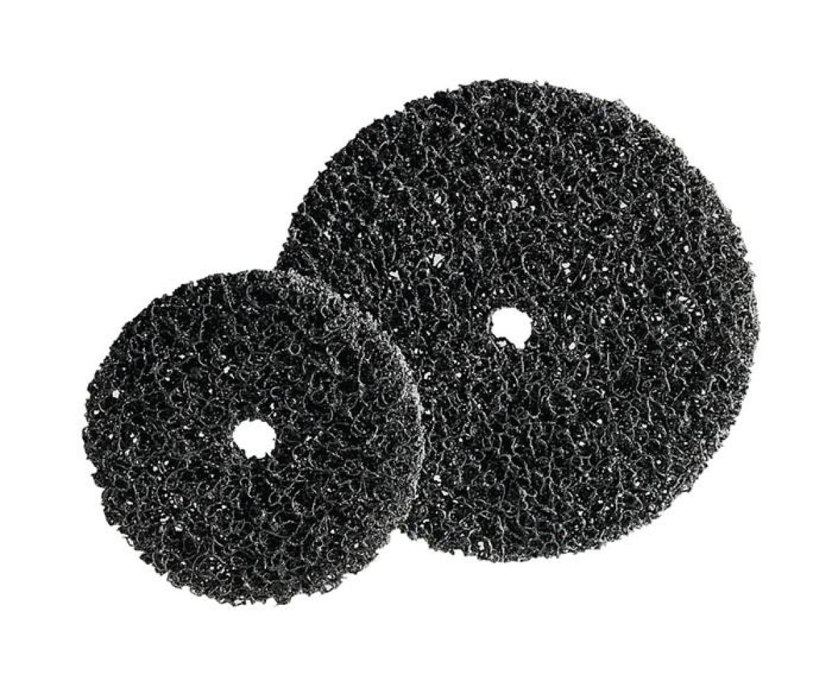 sehr grobes und aggressives Reinigungsvlies, durchsetzt mit Spezialkorn · hohe Abtragleistung · lange Standzeit · sehr gut geeignet zur Rost- und Lackentfernung · Reinigen von Schweißnähten · Entfernen von Klebern und Unterbodenschutz · Reinigen von Betonplatten · Beseitigung von Zunder · Bohrung 13 mm Ø