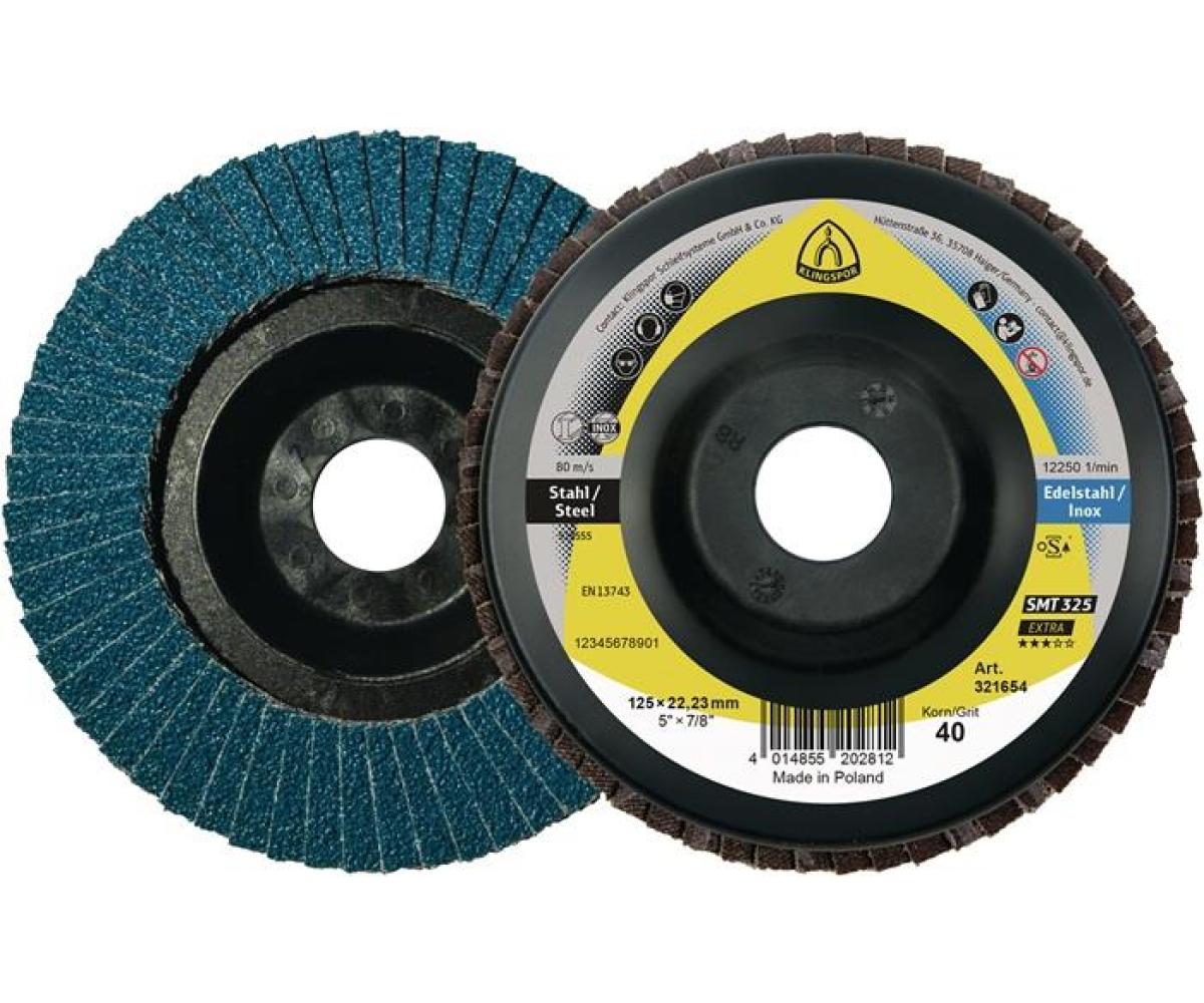 Weitere technische Eigenschaften · Bohrung: 22,23mm · Höchstgeschwindigkeit: 80m/s · Nutzungsart: Winkelschleifer mit Schleifmopteller · Qualität: Extra · Teller: Kunststoff, glasfaserverstärkt · Verpackungsart: Folie/Beutel · Fächerscheibe SMT 325 · Extra D.115mm K.40 · ger.INOX,STA ZK KLINGSPOR ·