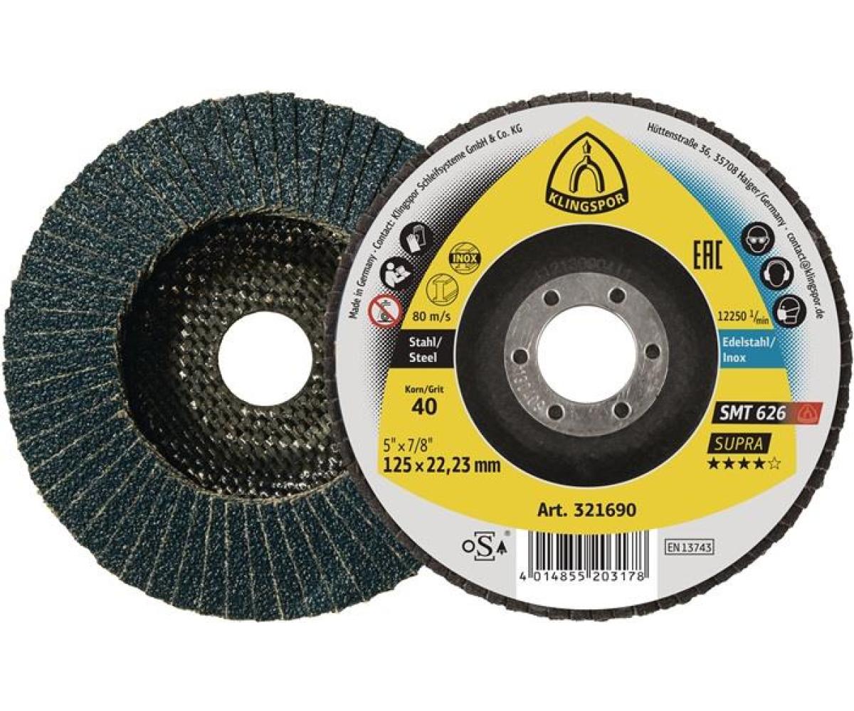 Weitere technische Eigenschaften · Bohrung: 22,23mm · Höchstgeschwindigkeit: 80m/s · Nutzungsart: Winkelschleifer mit Schleifmopteller · Qualität: Supra · Teller: Glasgewebe · Verpackungsart: Karton · Fächerscheibe SMT 626 · Supra D.180mm K.60 6Grad · kon.INOX ZK KLINGSPOR ·