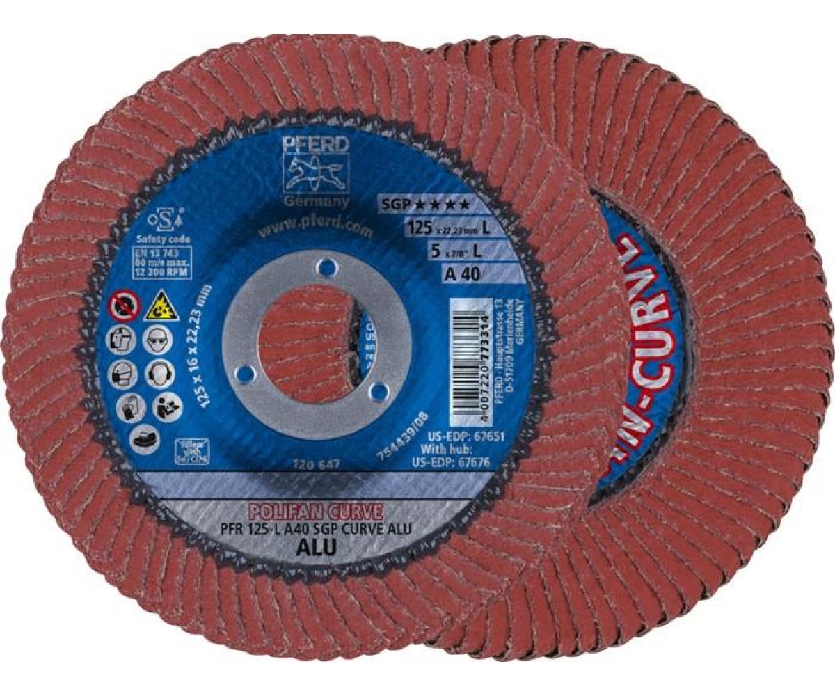Weitere technische Eigenschaften · Bohrung: 22,23mm · Antriebsart: Winkelschleifer · Anwendungsempfehlung: Für Kehlnahtradien > 8 mm bzw. einer Schweißnahtdicke (a-Maß) ? 6 mm bei 90°-Stoß, Breite am Radius: 14 mm, Nach Verschleiß am Umfang weiter wie eine konventionelle Fächerscheibe einsetzbar. · Bearbeitbare Werkstoffe: Weitere NE-Metalle, Aluminium · Größe: L (14 mm) · Hinweis: PFERDERGONOMICS empfiehlt Fächerscheiben POLIFAN-CURVE, um die beim Einsatz entstehende Vibrations-, Lärm- und Staubentwicklung nachhaltig zu senken und den Arbeitskomfort spürbar zu verbessern. PFERDEFFICIENCY empfiehlt Fächerscheiben POLIFAN-CURVE für perfekte Ergebnisse in kürzester Zeit. · Kehlnahtradius: 8mm · Vorteile: Präzises und optimales Ausschleifen der Kehlnahtgeometrie. Herausragende Standzeit bei der Bearbeitung von Kehlnähten. Hohe Abtragsleistung sichert einen schnellen Arbeitsfortschritt und damit deutliche Einsparung von Lohnkosten. · Fächerscheibe POLIFAN® A · SGP CURVE ALU D.125mm · K.40 Korund A-COOL Ausf.L ·