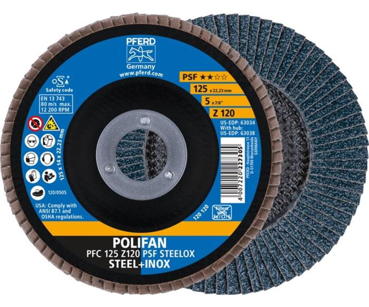 Weitere technische Eigenschaften · Bohrung: 22,23mm · Antriebsart: Akkuwinkelschleifer, Winkelschleifer · Aufnahmesystem: Bohrung · Bearbeitbare Werkstoffe: Edelstahl (INOX), Stahl · Hinweis: PFERDERGONOMICS empfiehlt POLIFAN-Fächerscheiben, um die beim Einsatz entstehende Vibrations-, Lärm- und Staubentwicklung nachhaltig zu senken und den Arbeitskomfort spürbar zu verbessern. PFERDEFFICIENCY empfiehlt POLIFAN-Fächerscheiben für perfekte Ergebnisse in kürzester Zeit. · Vorteile: Auch für leistungsschwache Winkelschleifer geeignet. Gute Standzeit. Schneller Arbeitsfortschritt und hohe Wirtschaftlichkeit durch hohe Zerspanungsleistung. · Fächerscheibe POLIFAN Z · PSF STEELOX D.125mm K.120 · kon.STA/INOX ZK Z PFERD ·