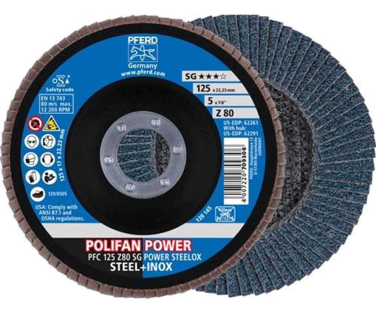 Weitere technische Eigenschaften · Antriebsart: Winkelschleifer · Anwendungsempfehlung: Auf Stahl auch für den Flächenschliff geeignet. · Aufnahmesystem: Bohrung · Ausführung: keine Angabe · Bearbeitbare Werkstoffe: Edelstahl (INOX), Stahl · Bearbeitungsaufgaben: Anfasen, Entgraten, Schweißnahtbearbeitung · Form: PFC / B / T29 · Hinweis: PFERDERGONOMICS empfiehlt POLIFAN-Fächerscheiben, um die beim Einsatz entstehende Vibrations-, Lärm- und Staubentwicklung nachhaltig zu senken und den Arbeitskomfort spürbar zu verbessern. PFERDEFFICIENCY empfiehlt POLIFAN-Fächerscheiben für perfekte Ergebnisse in kürzester Zeit. · Ø Bohrung: 22,23mm · Vorteile: Weniger Werkzeugwechsel durch herausragende Standzeit. Höchste Aggressivität über die gesamte Lebensdauer. Schneller Arbeitsfortschritt und höchste Wirtschaftlichkeit durch aggressive Zerspanungsleistung. · Fächerscheibe POWER · STEELOX D.125mm K.80 INOX · ZK Z Ausf.kon.PFERD ·