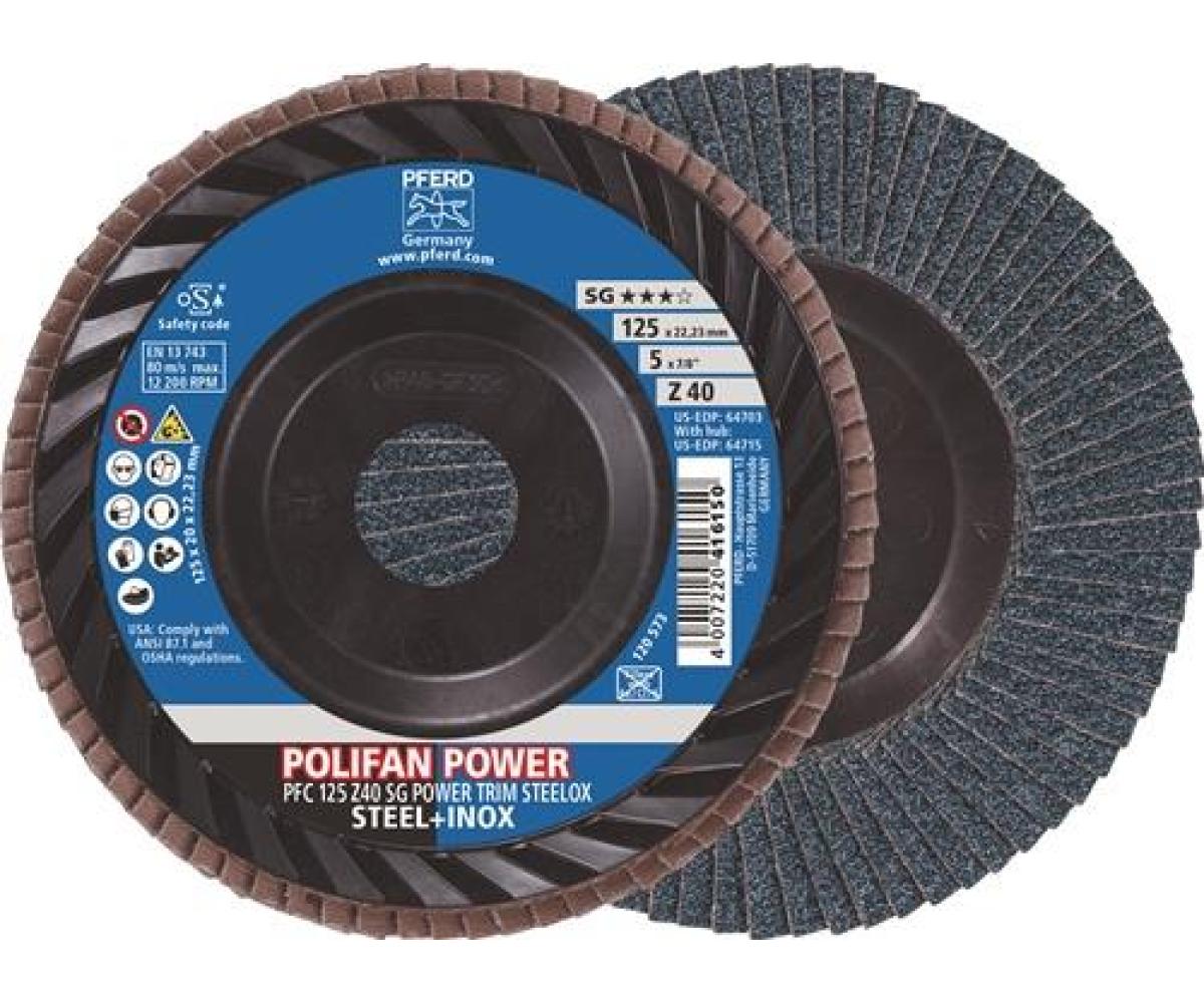 Weitere technische Eigenschaften · Bohrung: 22,23mm · Antriebsart: Winkelschleifer · Anwendungsempfehlung: Auf Stahl auch für den Flächenschliff geeignet. Der Tragteller darf maximal so weit zurückgesetzt werden, dass die Lamellen 5 mm überstehen. Setzen Sie das Werkzeug vorsichtig an und erhöhen Sie den Druck, bis ein Span entsteht. Halten Sie den Druck, bis das Werkzeug auf das gewünschte Maß gebracht wurde. Trimmen Sie die Fächerscheibe an scharfen Metallkanten, Feilen oder mit Wendeschneidplatten. Das Trimmen darf nur mit einem Anstellwinkel von 45° erfolgen. · Aufnahmesystem: Bohrung · Bearbeitbare Werkstoffe: Edelstahl (INOX), Stahl · Hinweis: PFERDERGONOMICS empfiehlt POLIFAN-Fächerscheiben, um die beim Einsatz entstehende Vibrations-, Lärm- und Staubentwicklung nachhaltig zu senken und den Arbeitskomfort spürbar zu verbessern. PFERDEFFICIENCY empfiehlt POLIFAN-Fächerscheiben für perfekte Ergebnisse in kürzester Zeit. · Vorteile: Das Zurücksetzen/Trimmen des Werkzeuges ist problemlos möglich. Weniger Werkzeugwechsel durch herausragende Standzeit. Höchste Aggressivität über die gesamte Lebensdauer. Schneller Arbeitsfortschritt und höchste Wirtschaftlichkeit durch aggressive Zerspanungsleistung. · Fächerscheibe TRIM · STEELOX D.125mm K.40 · PFC/B/T29 STA/VA ZK Z ·