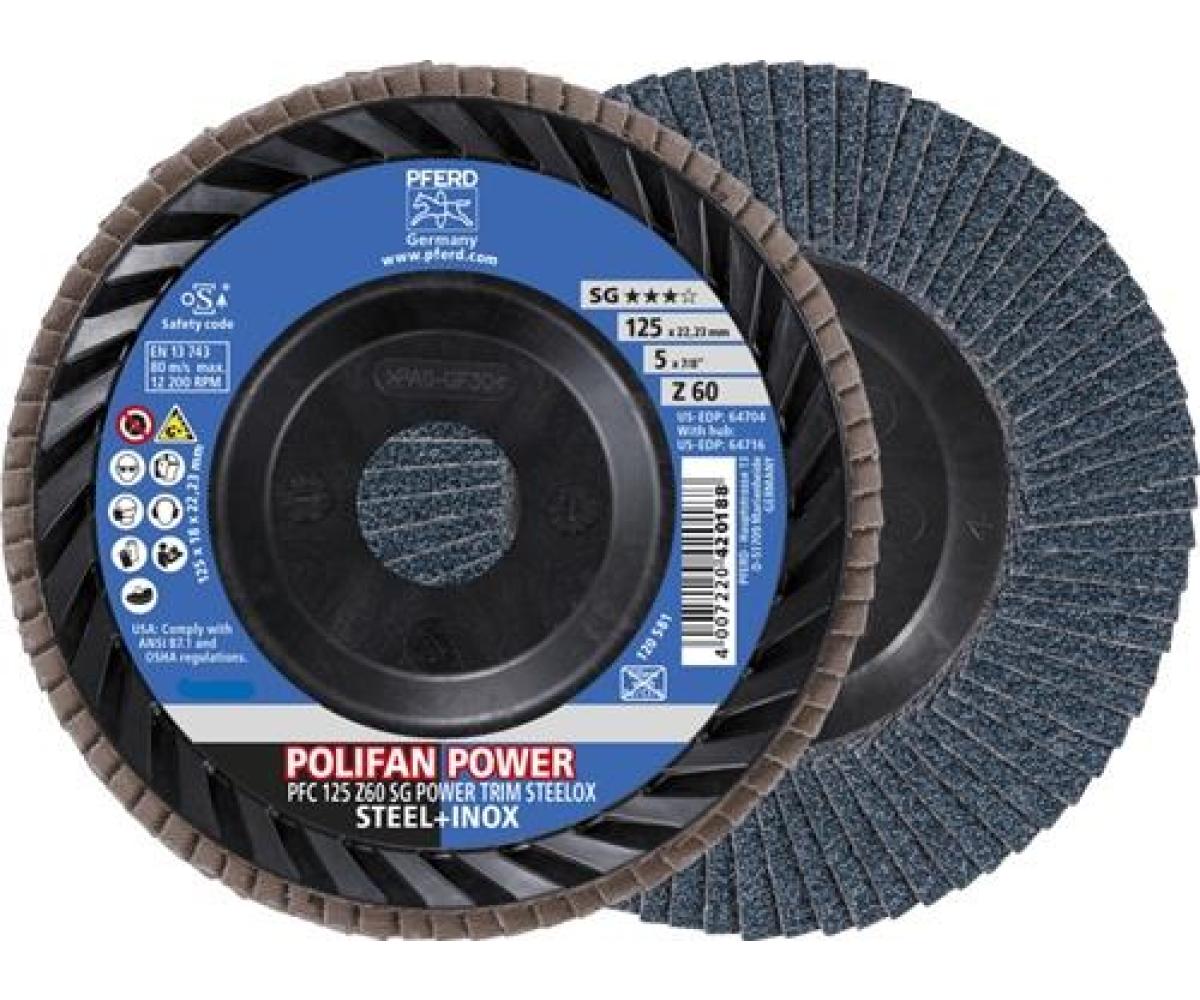 Weitere technische Eigenschaften · Bohrung: 22,23mm · Antriebsart: Winkelschleifer · Anwendungsempfehlung: Auf Stahl auch für den Flächenschliff geeignet. Trimmen Sie die Fächerscheibe an scharfen Metallkanten, Feilen oder mit Wendeschneidplatten. Das Trimmen darf nur mit einem Anstellwinkel von 45° erfolgen. Setzen Sie das Werkzeug vorsichtig an und erhöhen Sie den Druck, bis ein Span entsteht. Halten Sie den Druck, bis das Werkzeug auf das gewünschte Maß gebracht wurde. Der Tragteller darf maximal so weit zurückgesetzt werden, dass die Lamellen 5 mm überstehen. · Aufnahmesystem: Bohrung · Bearbeitbare Werkstoffe: Stahl, Edelstahl (INOX) · Hinweis: PFERDERGONOMICS empfiehlt POLIFAN-Fächerscheiben, um die beim Einsatz entstehende Vibrations-, Lärm- und Staubentwicklung nachhaltig zu senken und den Arbeitskomfort spürbar zu verbessern. PFERDEFFICIENCY empfiehlt POLIFAN-Fächerscheiben für perfekte Ergebnisse in kürzester Zeit. · Vorteile: Schneller Arbeitsfortschritt und höchste Wirtschaftlichkeit durch aggressive Zerspanungsleistung. Das Zurücksetzen/Trimmen des Werkzeuges ist problemlos möglich. Weniger Werkzeugwechsel durch herausragende Standzeit. Höchste Aggressivität über die gesamte Lebensdauer. · Fächerscheibe TRIM · STEELOX D.125mm K.60 · PFC/B/T29 STA/VA ZK Z ·