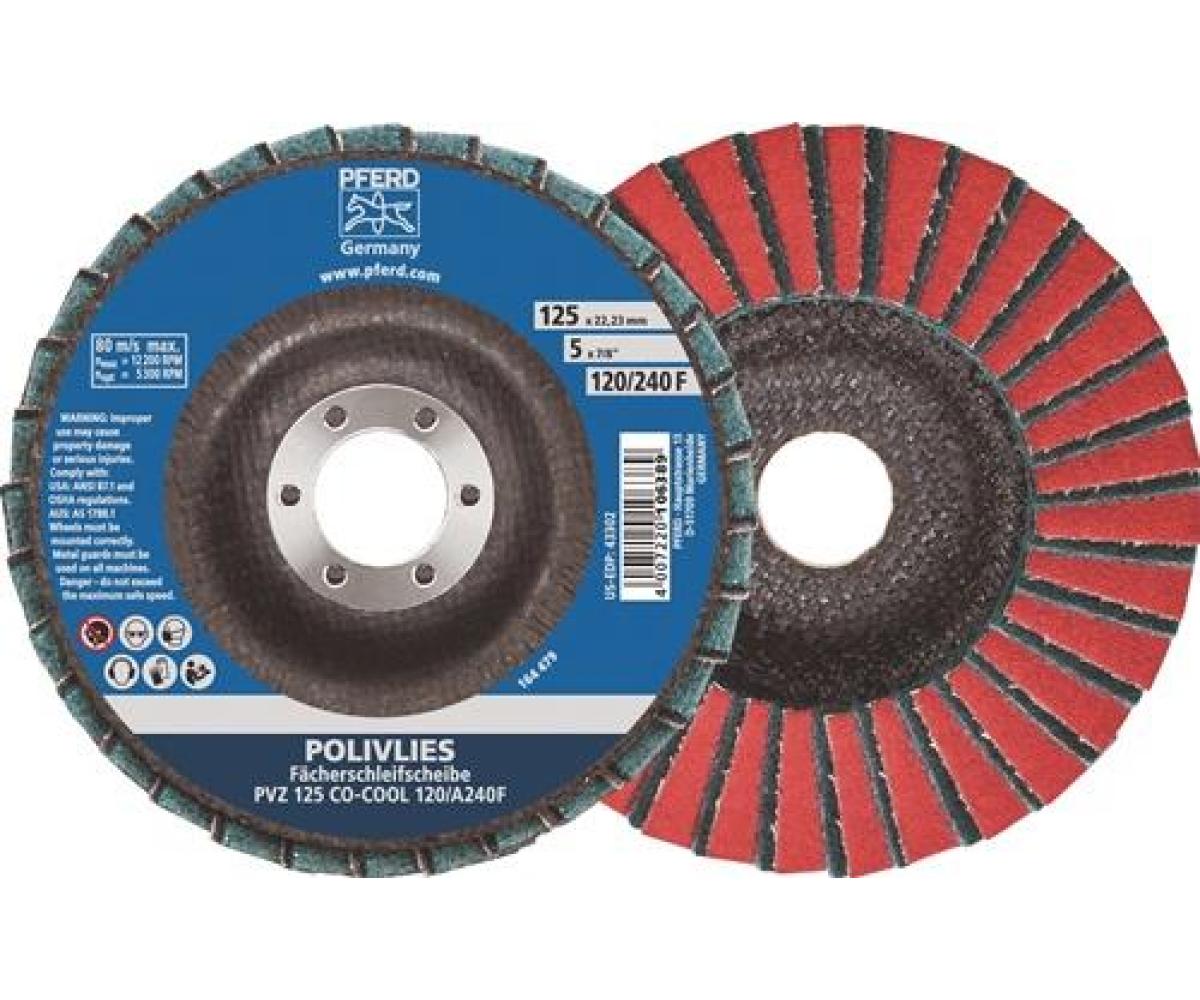 Weitere technische Eigenschaften · Antriebsart: Akkuwinkelschleifer, Winkelschleifer · Anwendungsempfehlung: Für beste Leistung bei einer empfohlenen Schnittgeschwindigkeit von 30–35 m/s einsetzen. · Bearbeitbare Werkstoffe: Edelstahl (INOX), Messing, Bronze, Stahlguss, Kobaltbasislegierungen, Kupfer, Faserverstärkte Duroplaste (GFK, CFK), Zink, Nickelbasislegierungen (z. B. Inconell und Hasteloy), Aluminium, Stahlwerkstoffe mit einer Härte > 54 HRC, Stähle bis 1.200 N/mm² (< 38 HRC), Thermoplaste, Titan, Titanlegierungen, Gehärtete, vergütete Stähle über 1.200 N/mm² (< 38 HRC) · Bearbeitungsaufgaben: Stufenweises Feinschleifen, Schweißnahtbearbeitung, Flächenbearbeitung, Strukturieren (Mattieren, Strichmattieren und Satinieren), Aufrauen, Reinigen, Entgraten · Breite: 18mm · Ø Bohrung: 22,23mm · RPM, opt., bis: 5300RPM · RPM, opt., von: 4600RPM · Sicherheitshinweise: Die angegebene maximal zulässige Drehzahl darf aus Sicherheitsgründen nie überschritten werden. · Vorteile: Erzeugt eine gleichbleibend hohe Oberflächengüte über die gesamte Standzeit, da stetig neues, scharfes Schleifmittel freigesetzt wird. Optimale Konturenanpassung durch hohe Flexibilität. Hohe Wirtschaftlichkeit durch hohe Schleifleistung und Standzeit. · Fächerschleifscheibe · D.125mm K.120/240 F · Alu.Keramikkorn CO-COOL ·