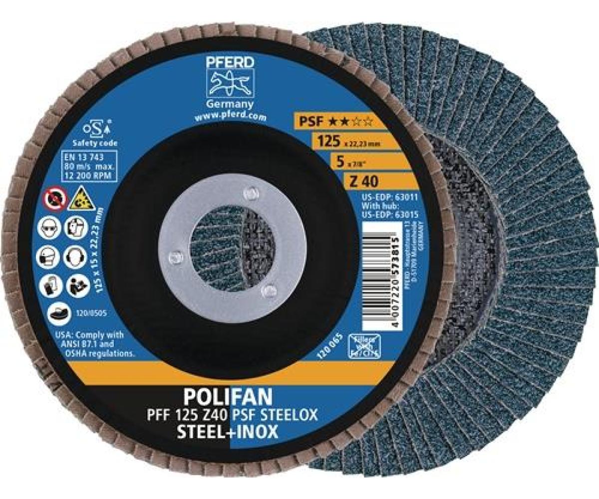 Weitere technische Eigenschaften · Antriebsart: Winkelschleifer · Aufnahmesystem: Bohrung · Ausführung: keine Angabe · Bearbeitbare Werkstoffe: Edelstahl (INOX), Stahl · Bearbeitungsaufgaben: Schweißnahtbearbeitung, Flächenschliff, Stufenweises Feinschleifen, Entgraten, Anfasen · Form: PFF / A / T27 · Hinweis: PFERDERGONOMICS empfiehlt POLIFAN-Fächerscheiben, um die beim Einsatz entstehende Vibrations-, Lärm- und Staubentwicklung nachhaltig zu senken und den Arbeitskomfort spürbar zu verbessern. PFERDEFFICIENCY empfiehlt POLIFAN-Fächerscheiben für perfekte Ergebnisse in kürzester Zeit. · Ø Bohrung: 22,23mm · Vorteile: Auch für leistungsschwache Winkelschleifer geeignet. Gute Standzeit. Schneller Arbeitsfortschritt und hohe Wirtschaftlichkeit durch hohe Zerspanungsleistung. · Fächerschleifscheibe · D.125mm K.80 fl.VA (INOX) · ZK Z PFERD ·